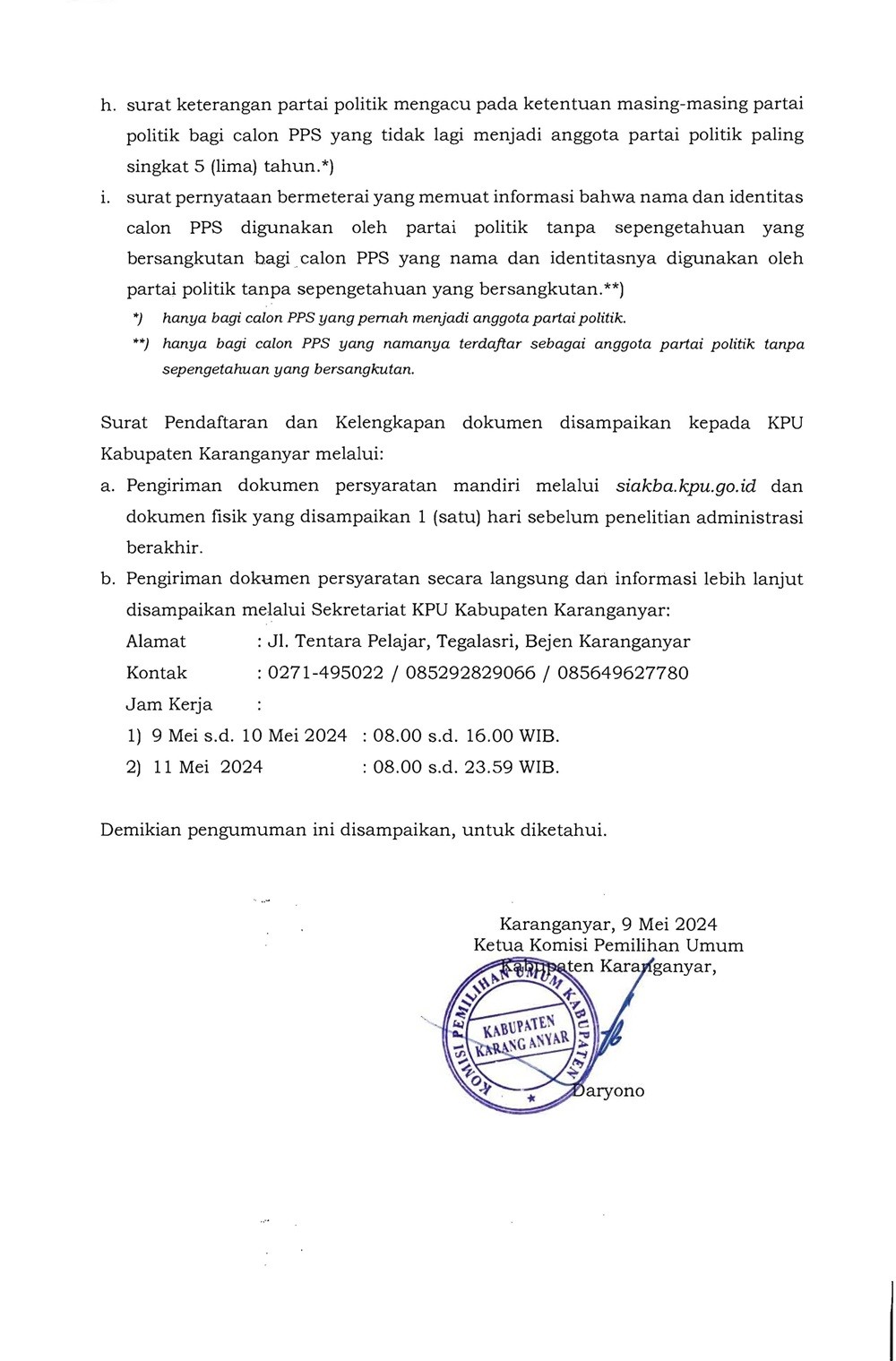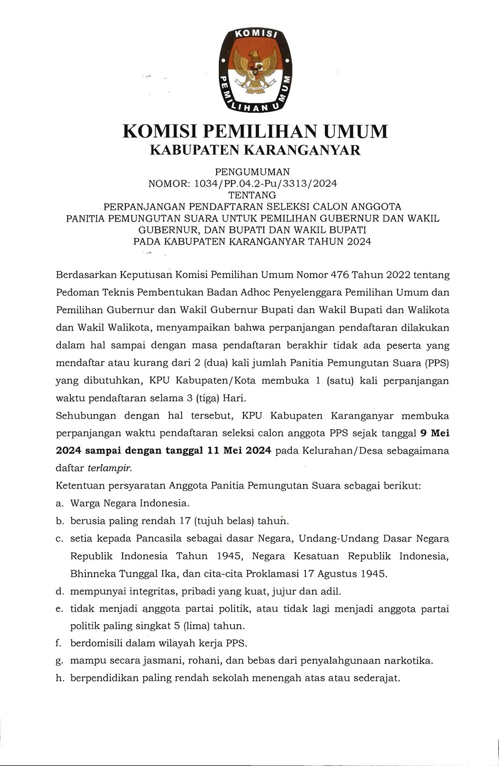 PENGUMUMAN PERPANJANGAN PENDAFTARAN SELEKSI CALON ANGGOTA PPS UNTUK PEMILIHAN GUBERNUR DAN WAKIL GUBERNUR, DAN BUPATI DAN WAKIL BUPATI PADA KABUPATEN KARANGANYAR TAHUN 2024 Kamis, 09 Mei 2024 07:00 220 DOWNLOAD PENGUMUMAN Bagikan: Telah dilihat 220 kali