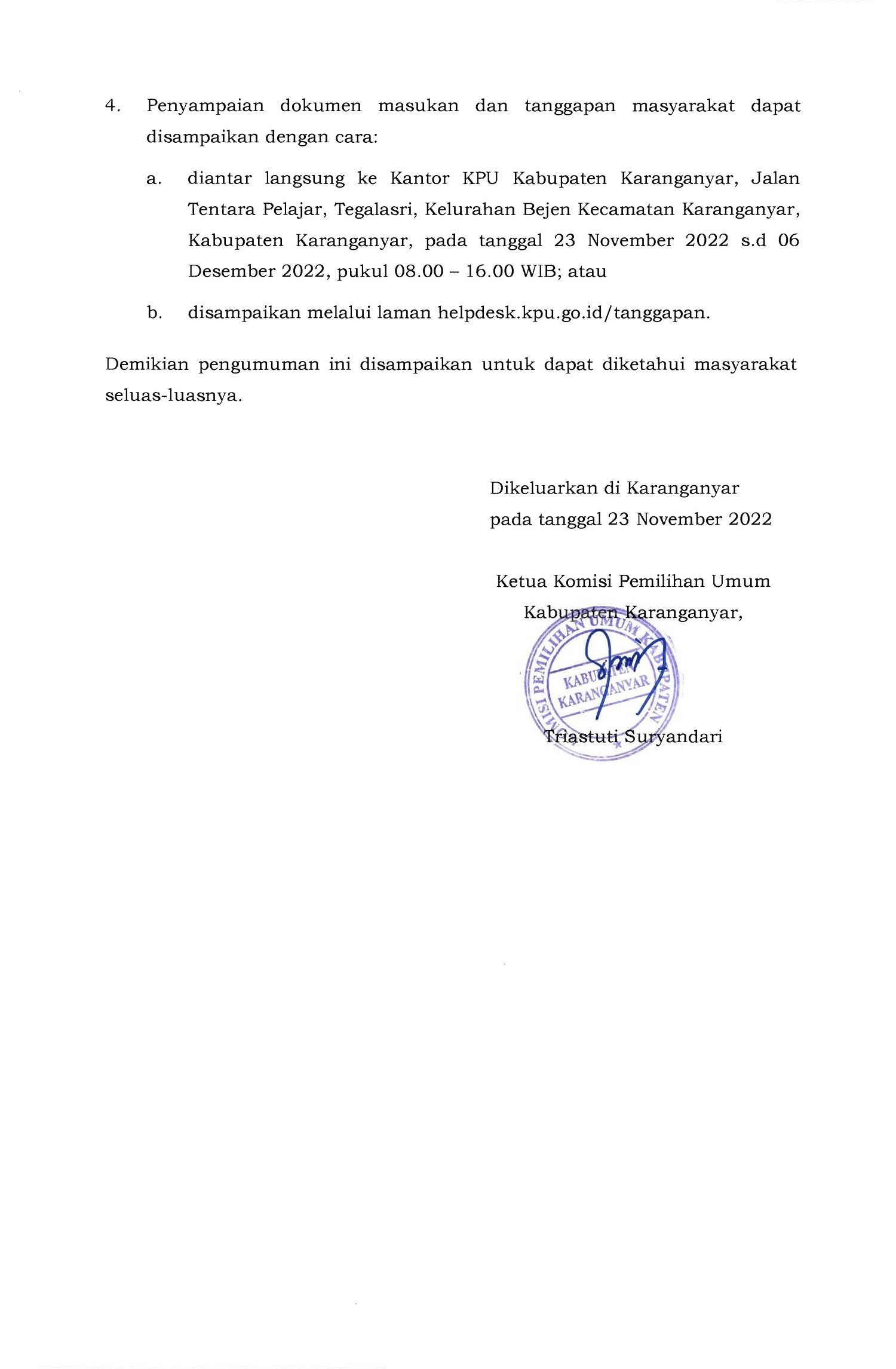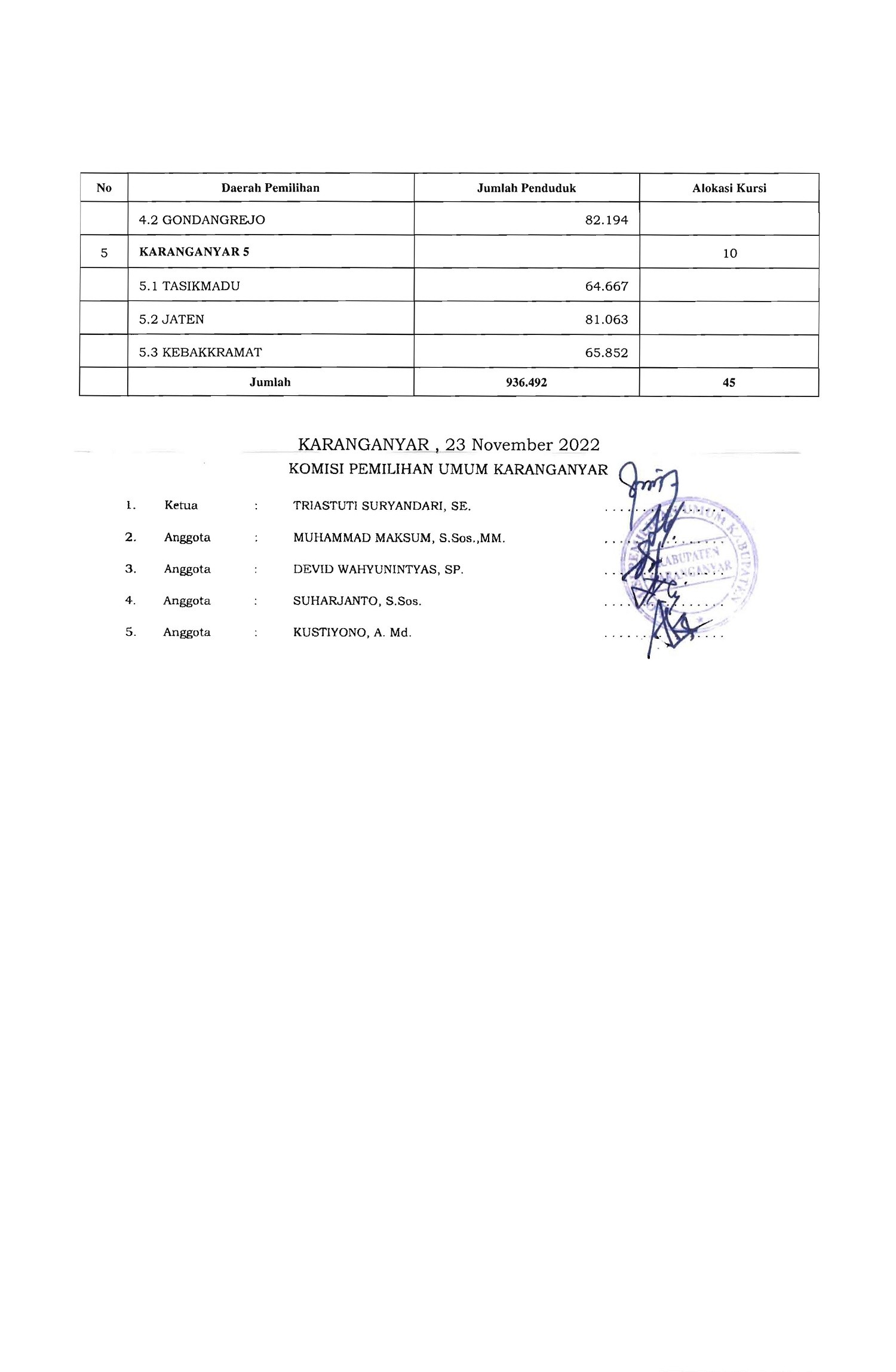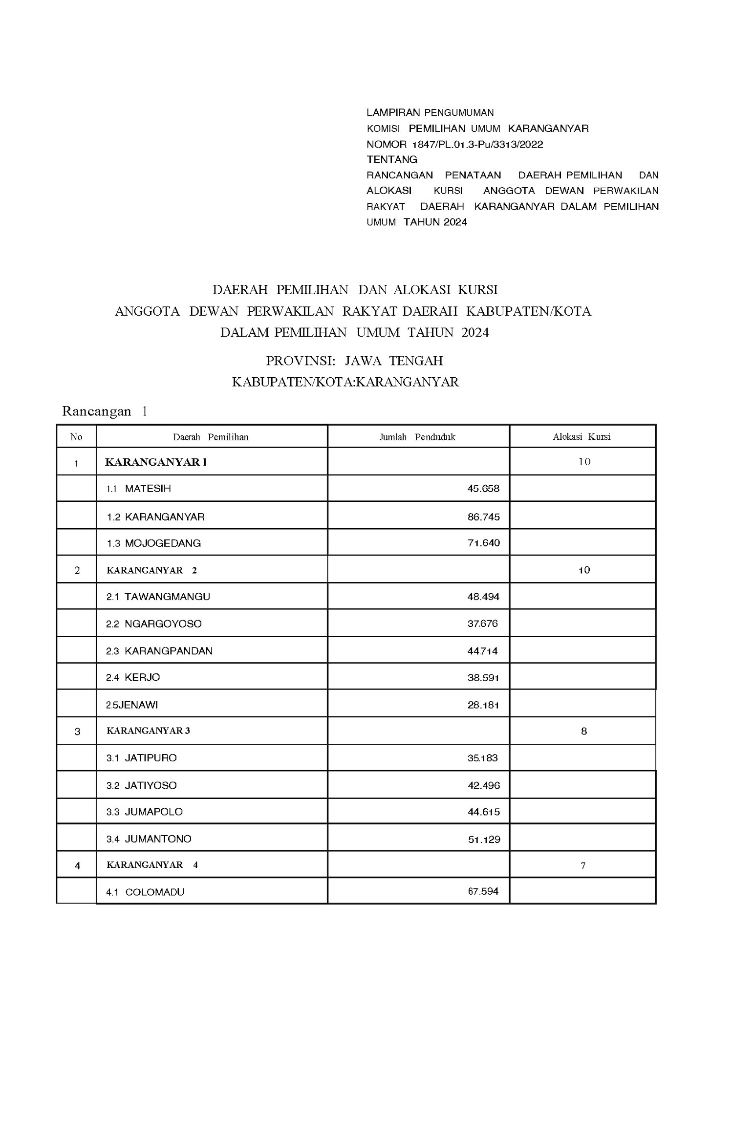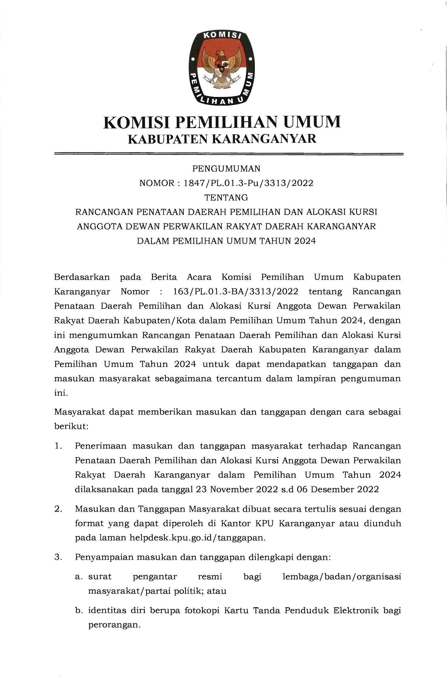 PENGUMUMAN RANCANGAN PENATAAN DAPIL DAN ALOKASI KURSI ANGGOTA DPRD KABUPATEN KARANGANYAR DALAM PEMILU 2024