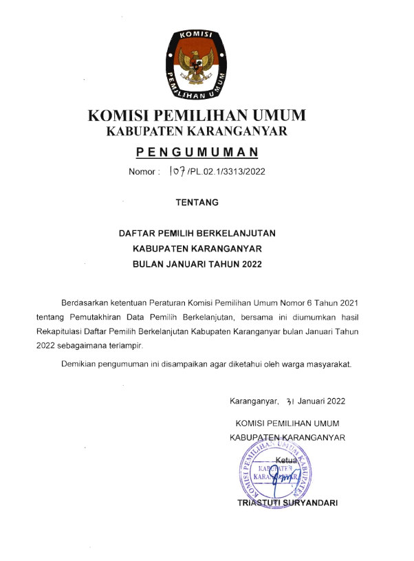 Pengumuman Rekapitulasi Daftar Pemilih Berkelanjutan Bulan Januari 2022 Senin, 31 Januari 2022 00:00 127 DOWNLOAD MODEL A.DPB (BYNAME) DOWNLOAD MODEL A.1-DPB Bagikan: Telah dilihat 127 kali
