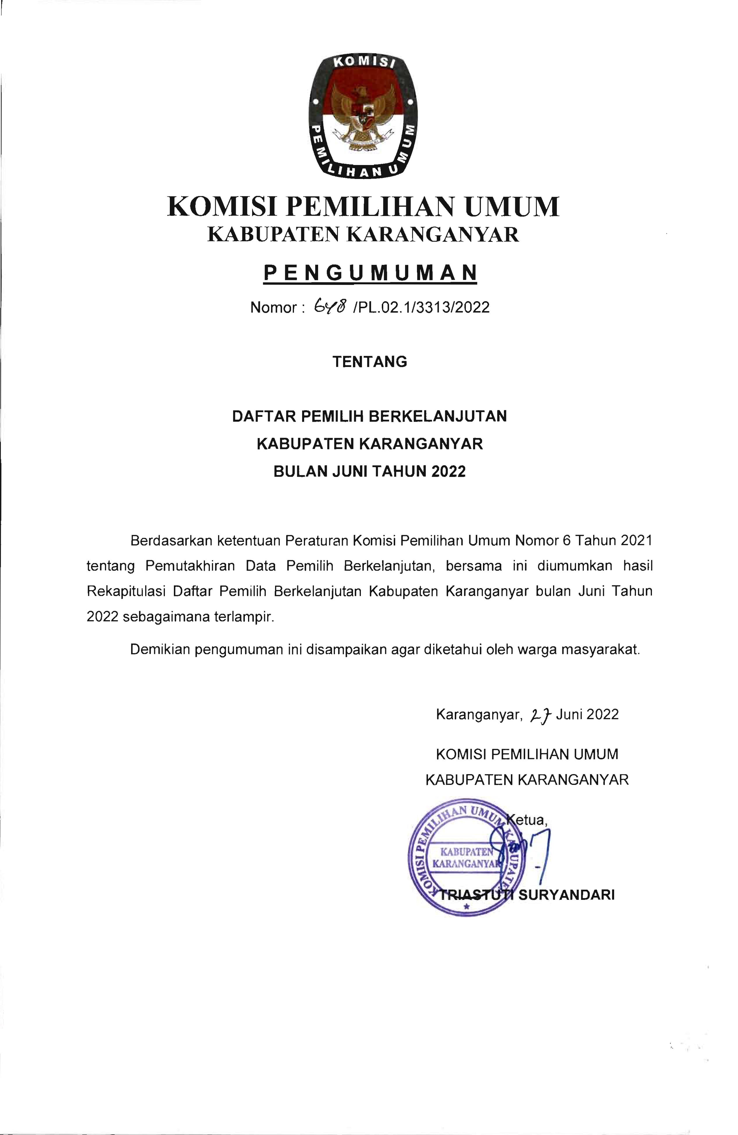 Pengumuman Rekapitulasi Daftar Pemilih Berkelanjutan Bulan Juni 2022