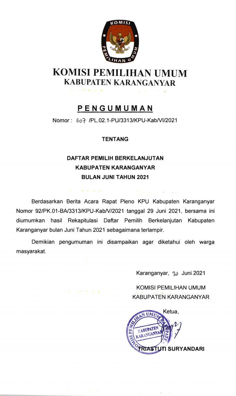 Pengumuman Rekapitulasi Daftar Pemilih Berkelanjutan JUNI 2021