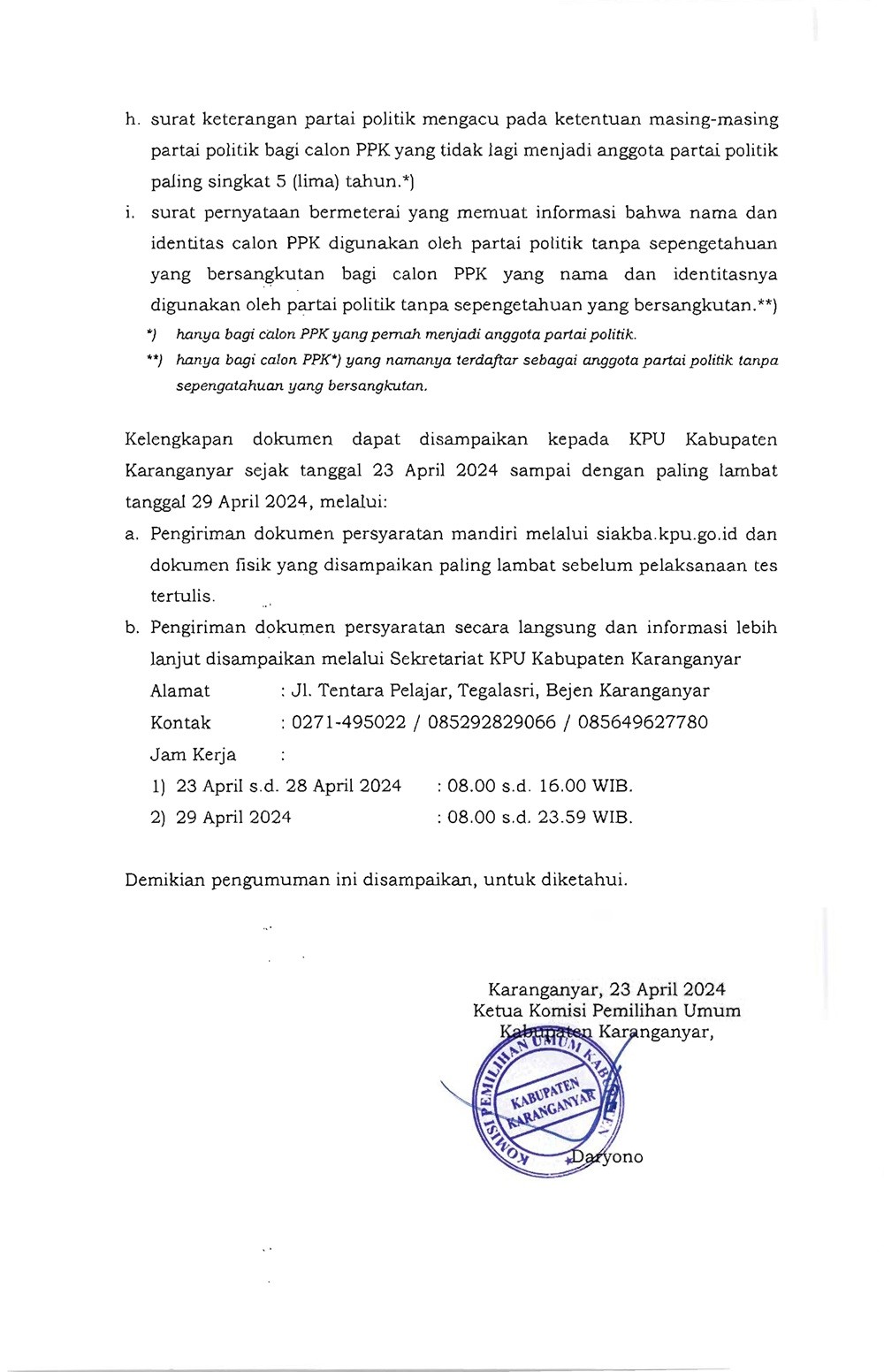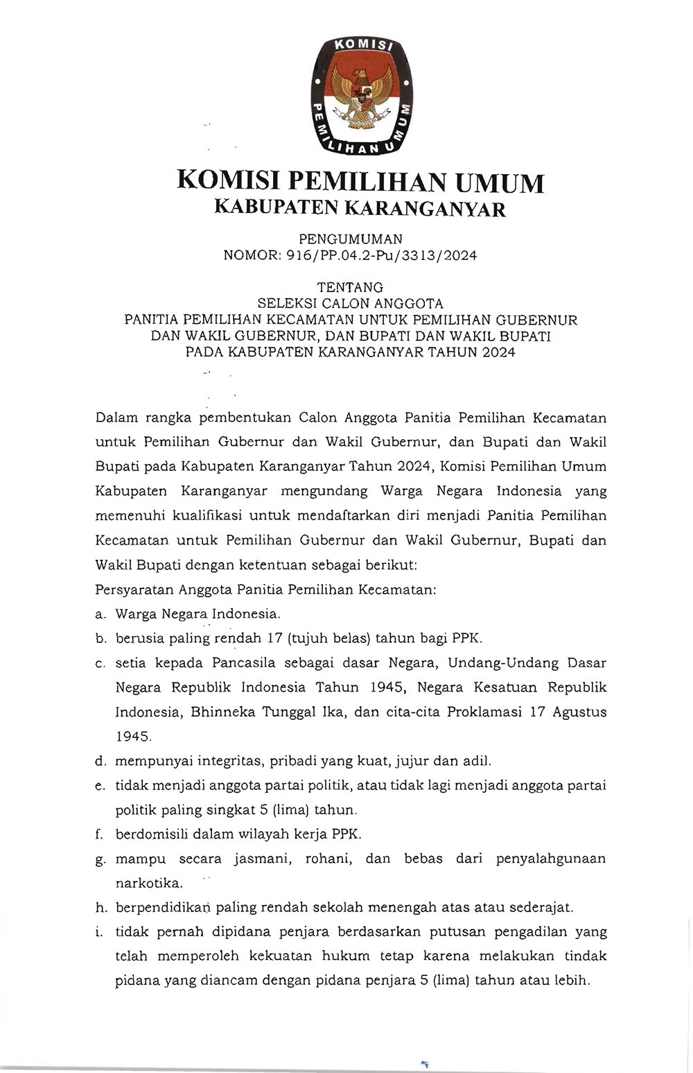 PENGUMUMAN SELEKSI CALON ANGGOTA PPK UNTUK PEMILIHAN GUBERNUR DAN WAKIL GUBERNUR, DAN BUPATI DAN WAKIL BUPATI PADA KABUPATEN KARANGANYAR TAHUN 2024