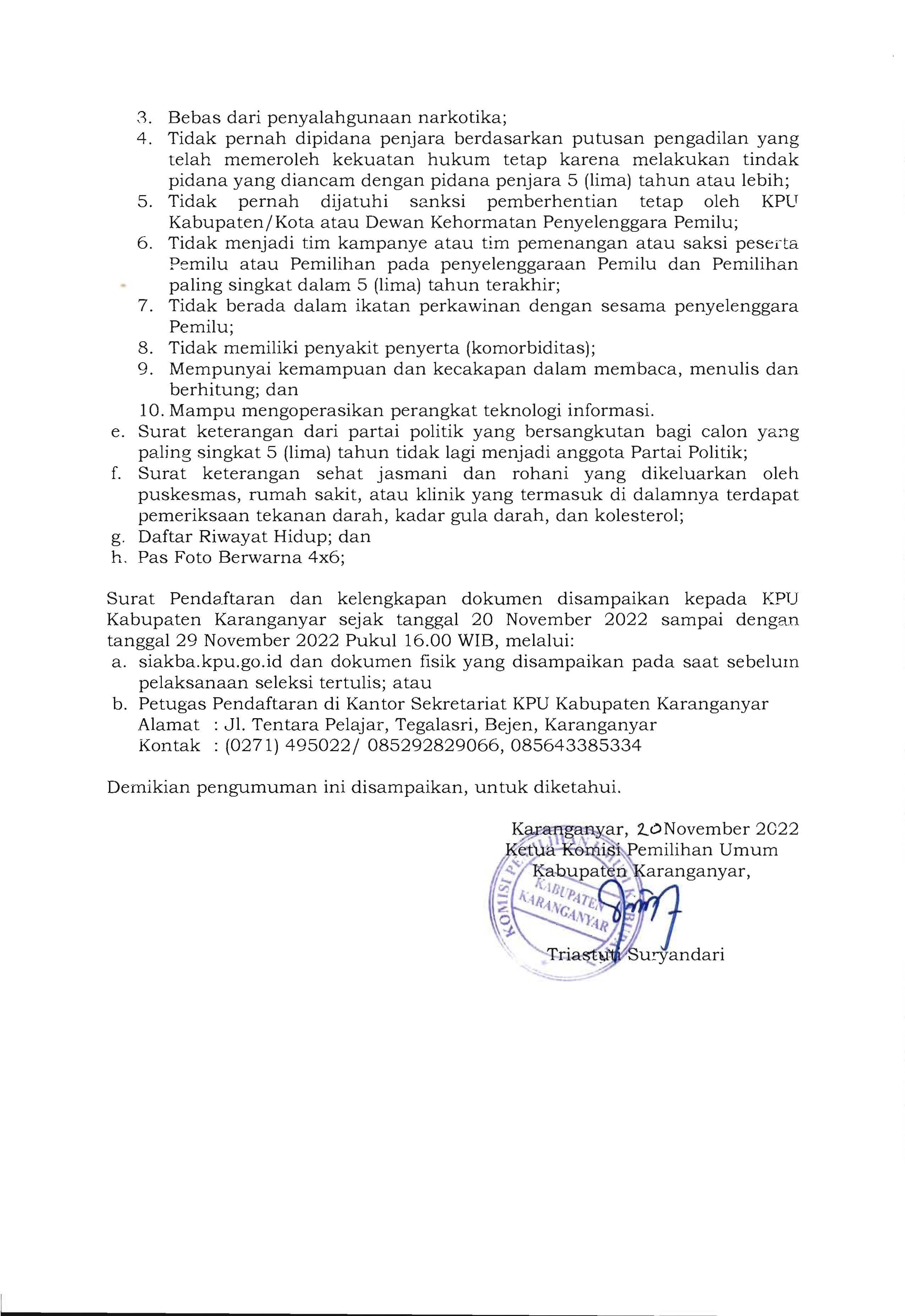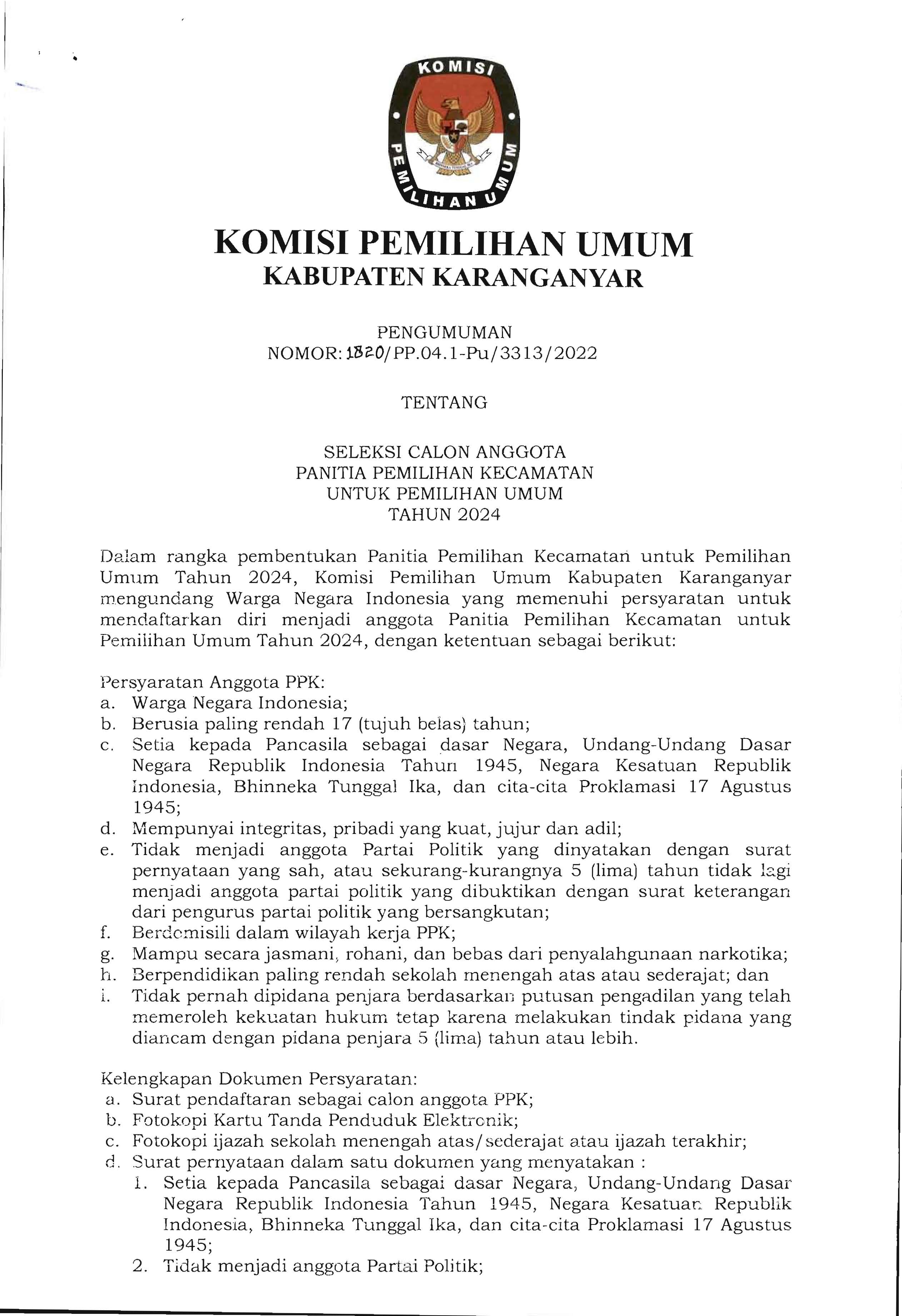 PENGUMUMAN SELEKSI CALON ANGGOTA PPK UNTUK PEMILU TAHUN 2024 Minggu, 20 November 2022 00:00 977 JADWAL SELEKSI DOWNLOAD PENGUMUMAN SURAT PENDAFTARAN | SURAT PERNYATAAN | DAFTAR RIWAYAT HIDUP Bagikan: Telah dilihat 977 kali