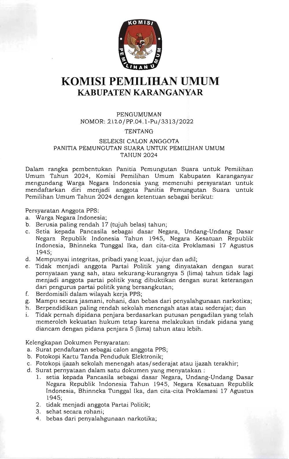 PENGUMUMAN SELEKSI CALON ANGGOTA PPS UNTUK PEMILU TAHUN 2024