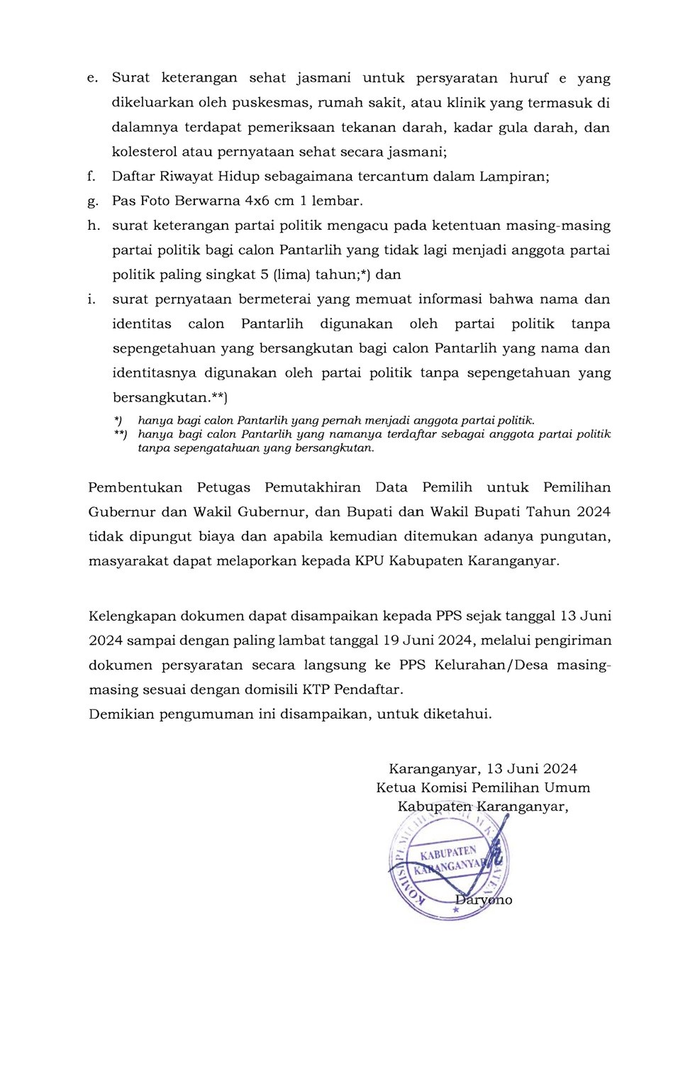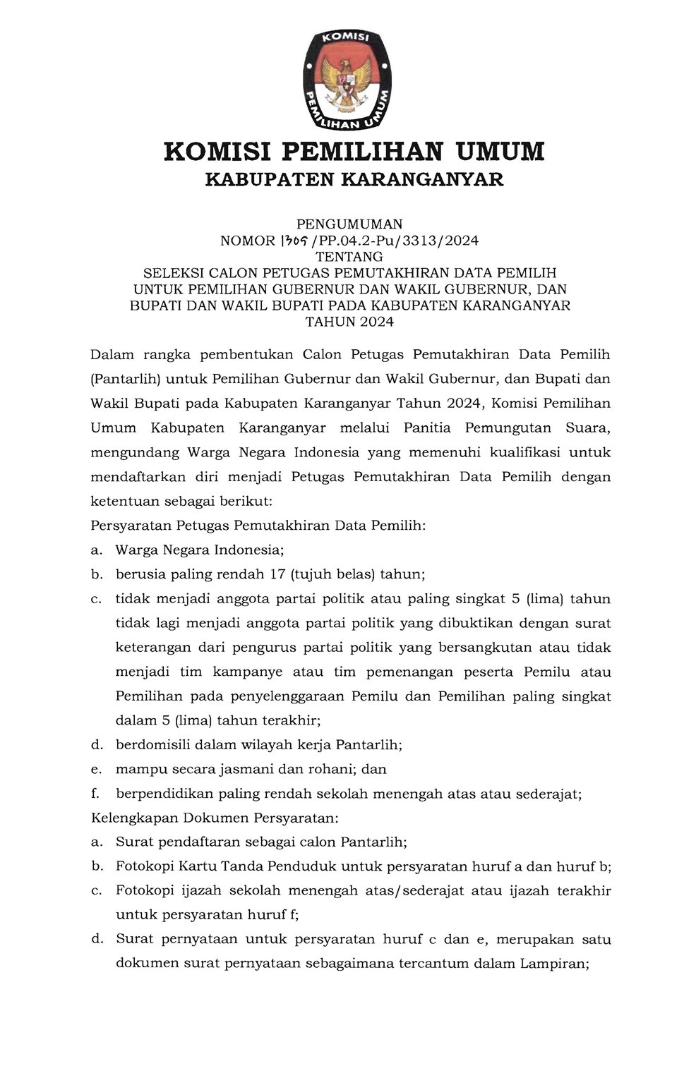 PENGUMUMAN SELEKSI CALON PANTARLIH UNTUK PEMILIHAN GUBERNUR DAN WAKIL GUBERNUR, DAN BUPATI DAN WAKIL BUPATI PADA KABUPATEN KARANGANYAR TAHUN 2024 Kamis, 13 Juni 2024 10:00 227 DOWNLOAD PENGUMUMAN Bagikan: Telah dilihat 227 kali