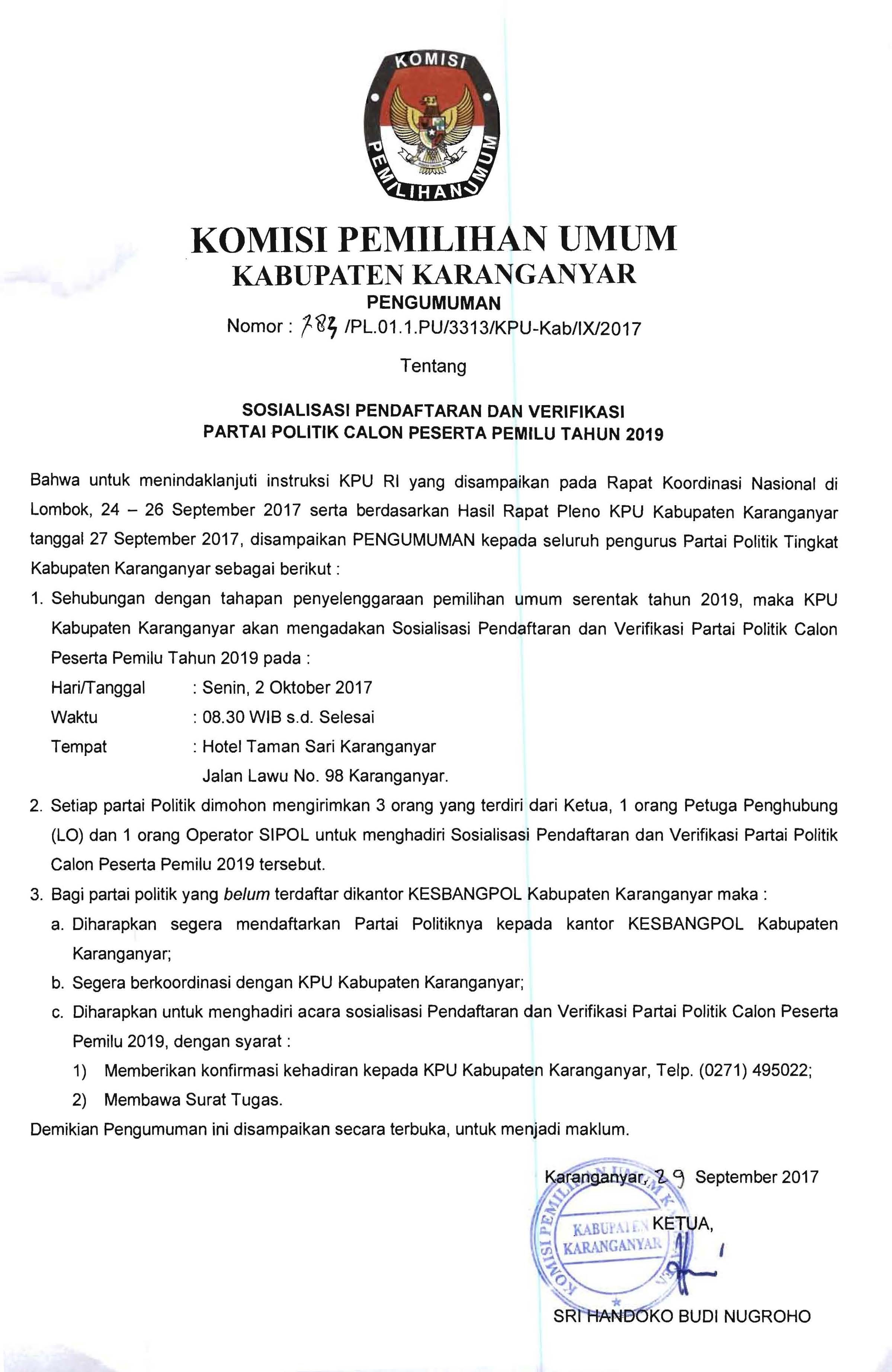 Pengumuman Sosialisasi Pendaftaran dan Verifikasi Partai Politik Calon Peserta PEMILU Tahun 2019 Jumat, 29 September 2017 00:00 41 DOWNLOAD Bagikan: Telah dilihat 41 kali