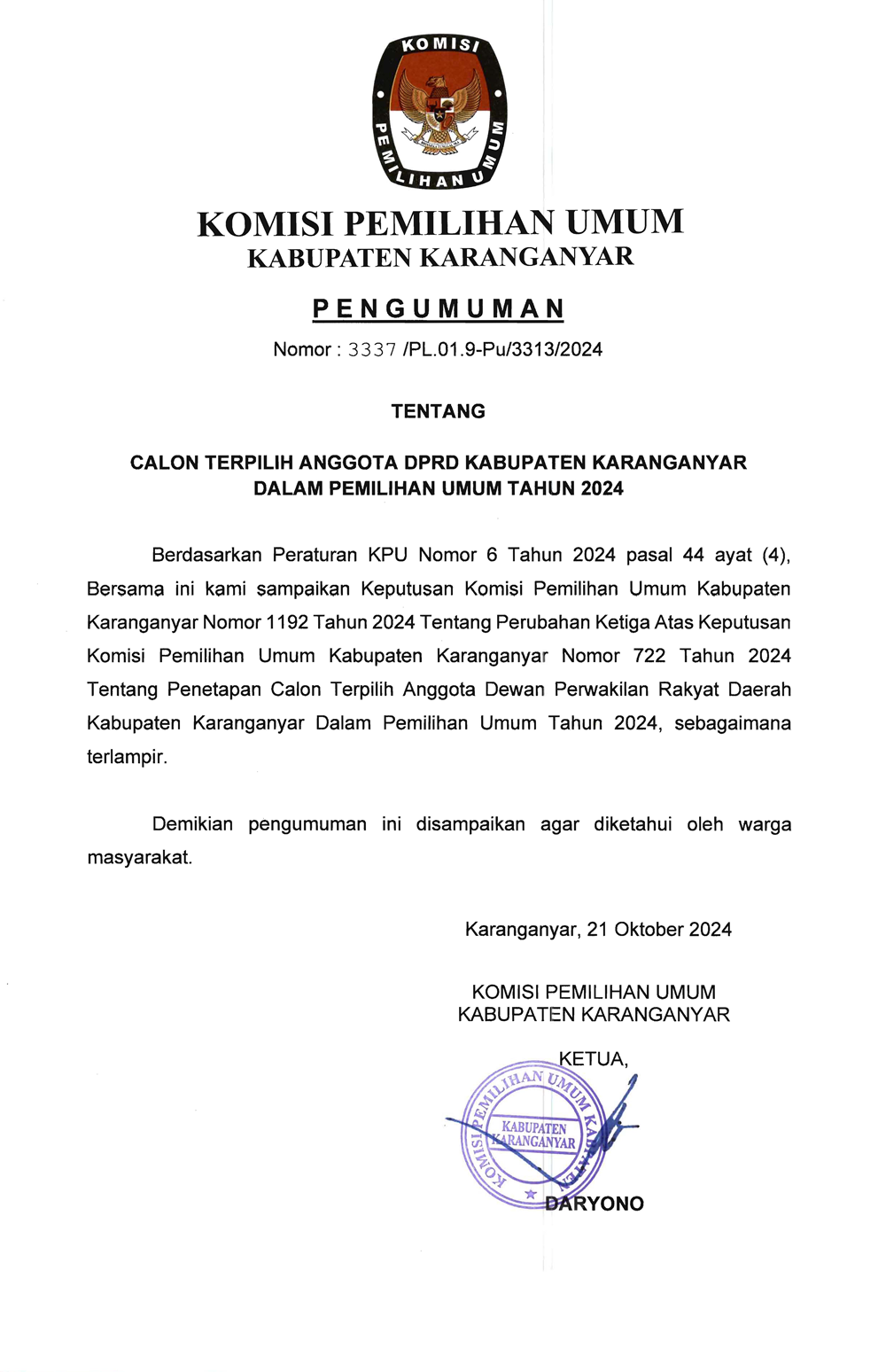Pengumuman tentang Calon Terpilih Anggota DPRD Kabupaten Karanganyar Dalam Pemilihan Umum Tahun 2024 Senin, 21 Oktober 2024 12:00 694 DOWNLOAD PENGUMUMAN DOWNLOAD SALINAN SK No. 1192 TAHUN 2024 Bagikan: Telah dilihat 694 kali
