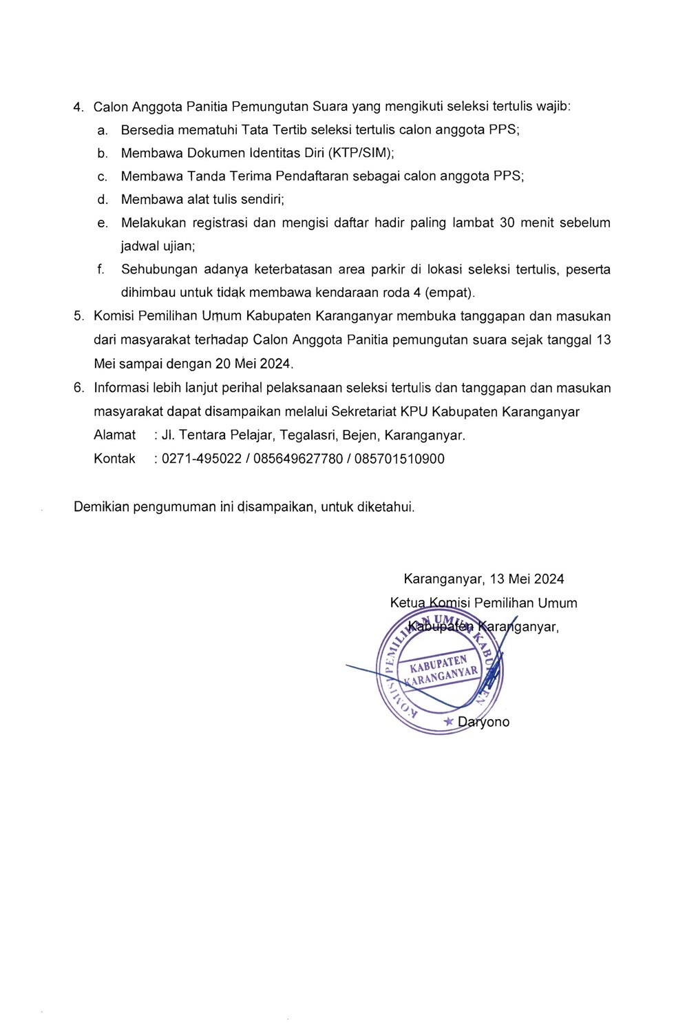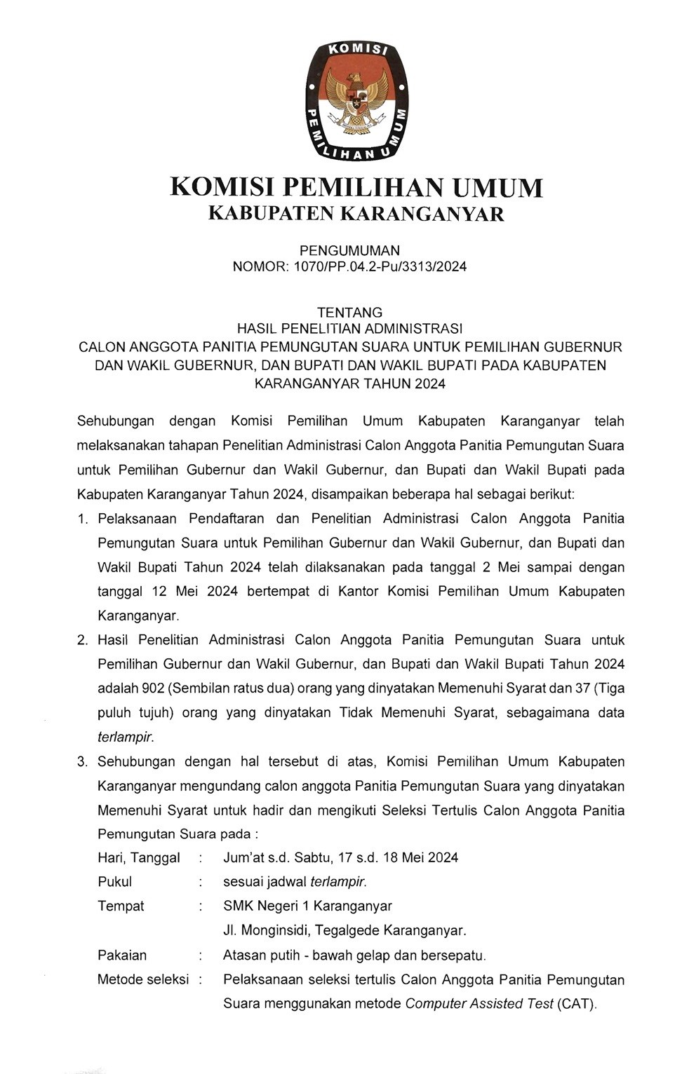 PENGUMUMAN TENTANG HASIL ADMINISTRASI CALON ANGGOTA PPS UNTUK PEMILIHAN GUBERNUR DAN WAKIL GUBERNUR, DAN BUPATI DAN WAKIL BUPATI PADA KABUPATEN KARANGANYAR TAHUN 2024 Senin, 13 Mei 2024 17:00 698 DOWNLOAD PENGUMUMAN Bagikan: Telah dilihat 698 kali