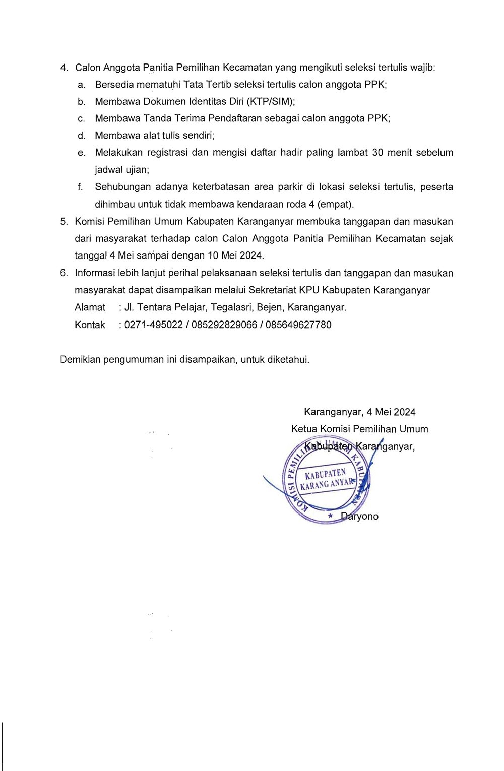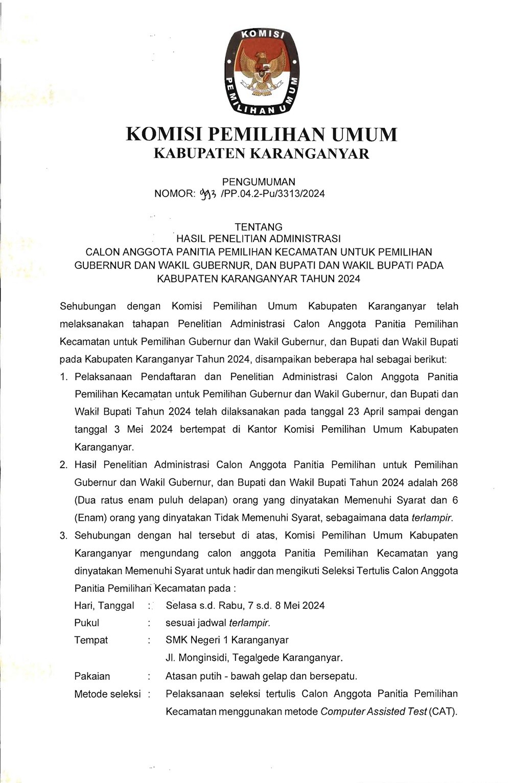 PENGUMUMAN TENTANG HASIL PENELITIAN ADMINISTRASI CALON ANGGOTA PPK UNTUK PEMILIHAN GUBERNUR DAN WAKIL GUBERNUR, DAN BUPATI DAN WAKIL BUPATI PADA KABUPATEN KARANGANYAR TAHUN 2024 Sabtu, 04 Mei 2024 07:00 450 DOWNLOAD PENGUMUMAN Bagikan: Telah dilihat 450 kali