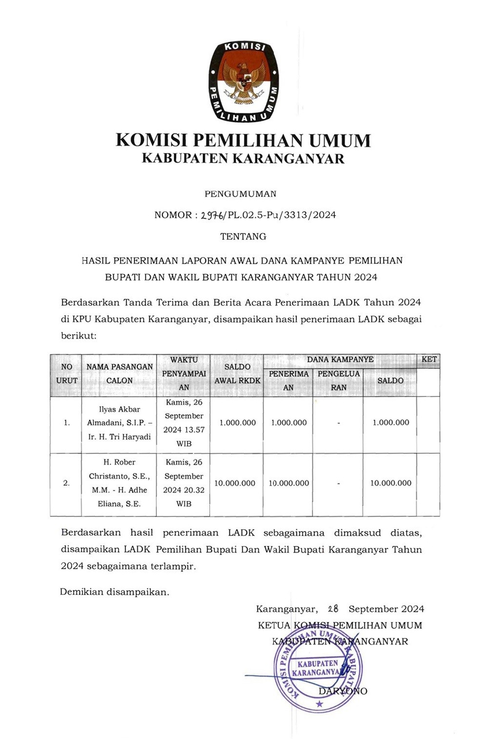 Pengumuman Tentang Hasil Penerimaan Laporan Awal Dana Kampanye Pemilihan Bupati dan Wakil Bupati Karanganyar Tahun 2024 Sabtu, 28 September 2024 10:00 141 DOWNLOAD PENGUMUMAN Bagikan: Telah dilihat 141 kali