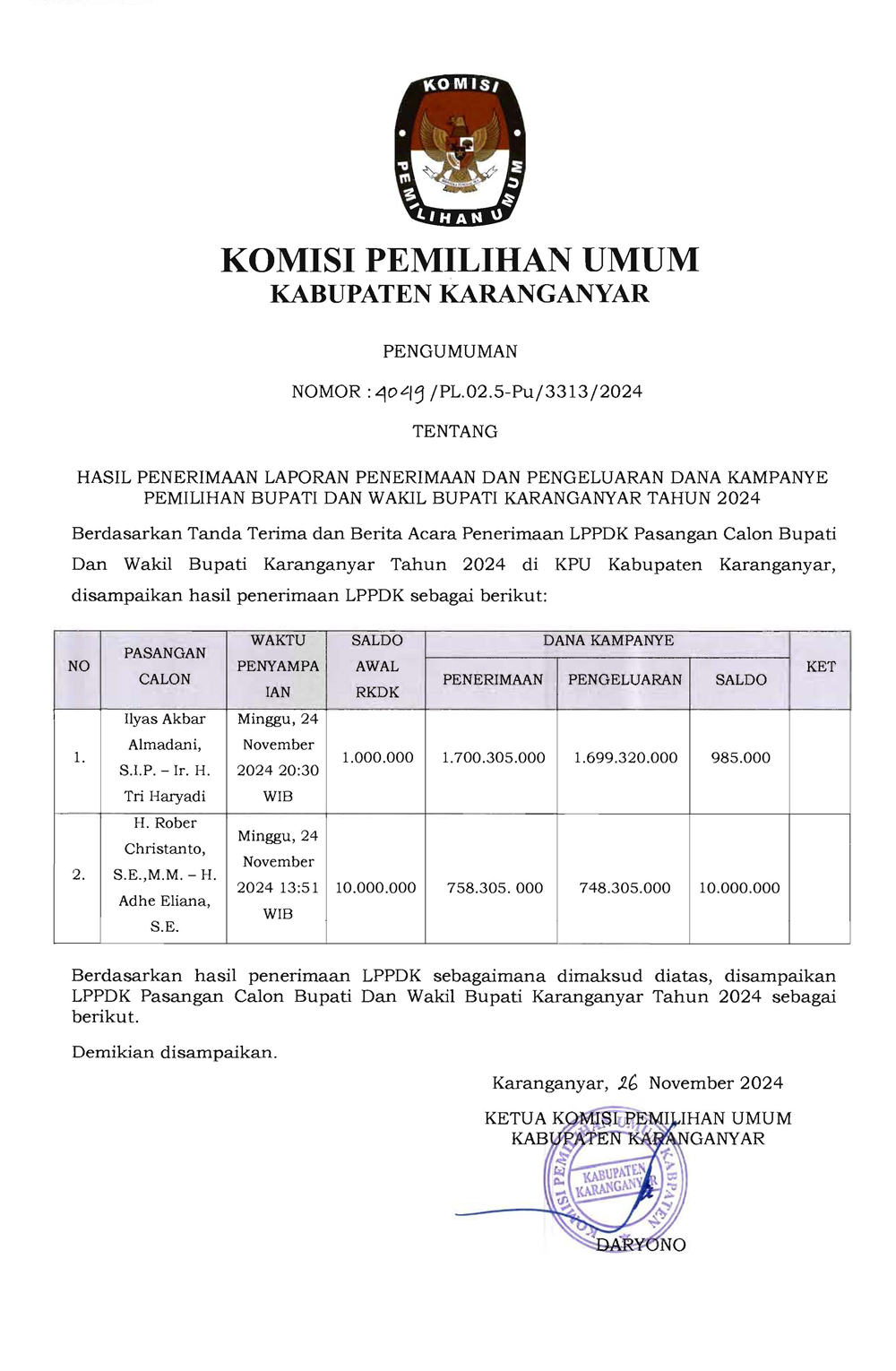 Pengumuman tentang Hasil Penerimaan LPPDK Pemilihan Bupati dan Wakil Bupati Karanganyar Tahun 2024 Selasa, 26 November 2024 14:00 699 DOWNLOAD PENGUMUMAN Bagikan: Telah dilihat 699 kali