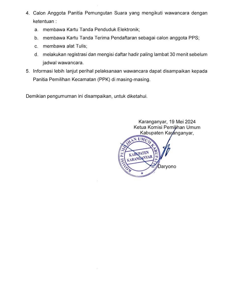 PENGUMUMAN TENTANG HASIL SELEKSI TERTULIS CALON ANGGOTA PPS UNTUK PEMILIHAN GUBERNUR DAN WAKIL GUBERNUR, DAN BUPATI DAN WAKIL BUPATI PADA KABUPATEN KARANGANYAR TAHUN 2024 Minggu, 19 Mei 2024 15:00 407 DOWNLOAD PENGUMUMAN Bagikan: Telah dilihat 407 kali
