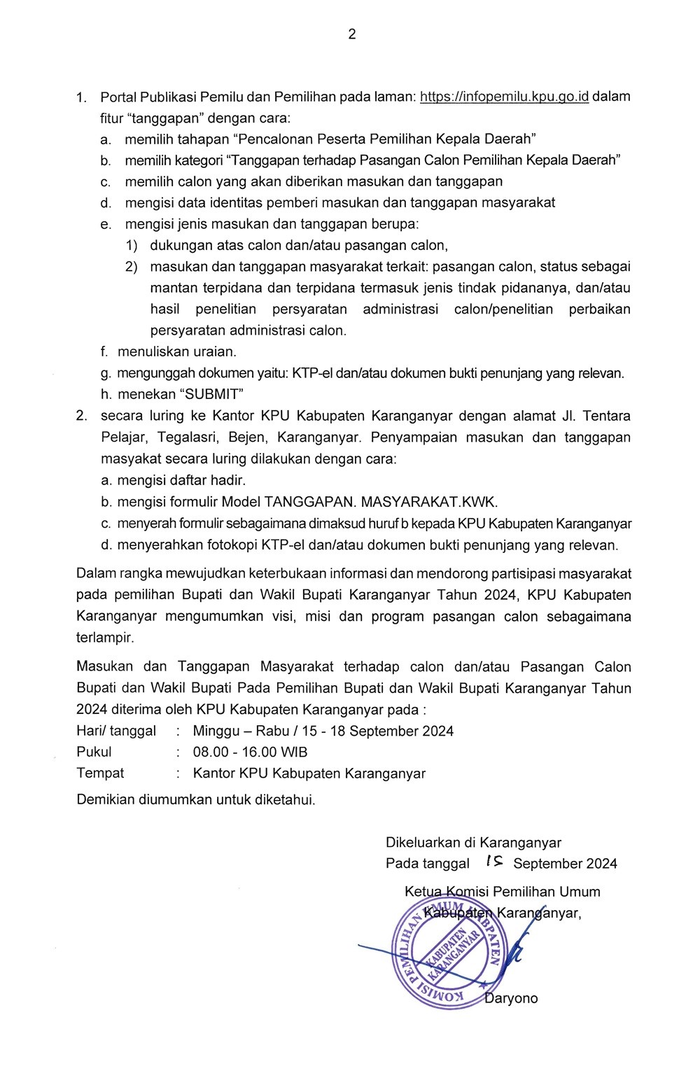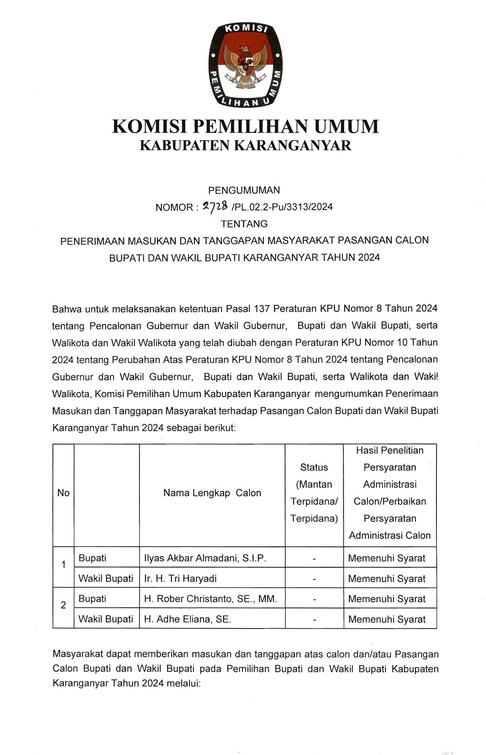 Pengumuman Tentang Penerimaan Masukan dan Tanggapan Masyarakat Pasangan Calon Bupati dan Wakil Bupati Karanganyar Tahun 2024