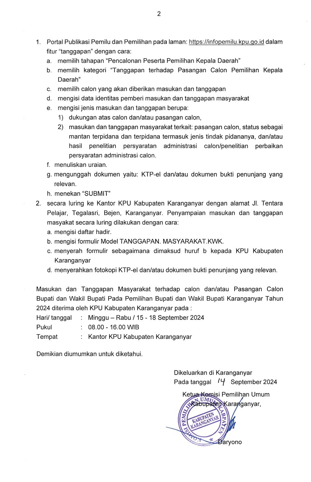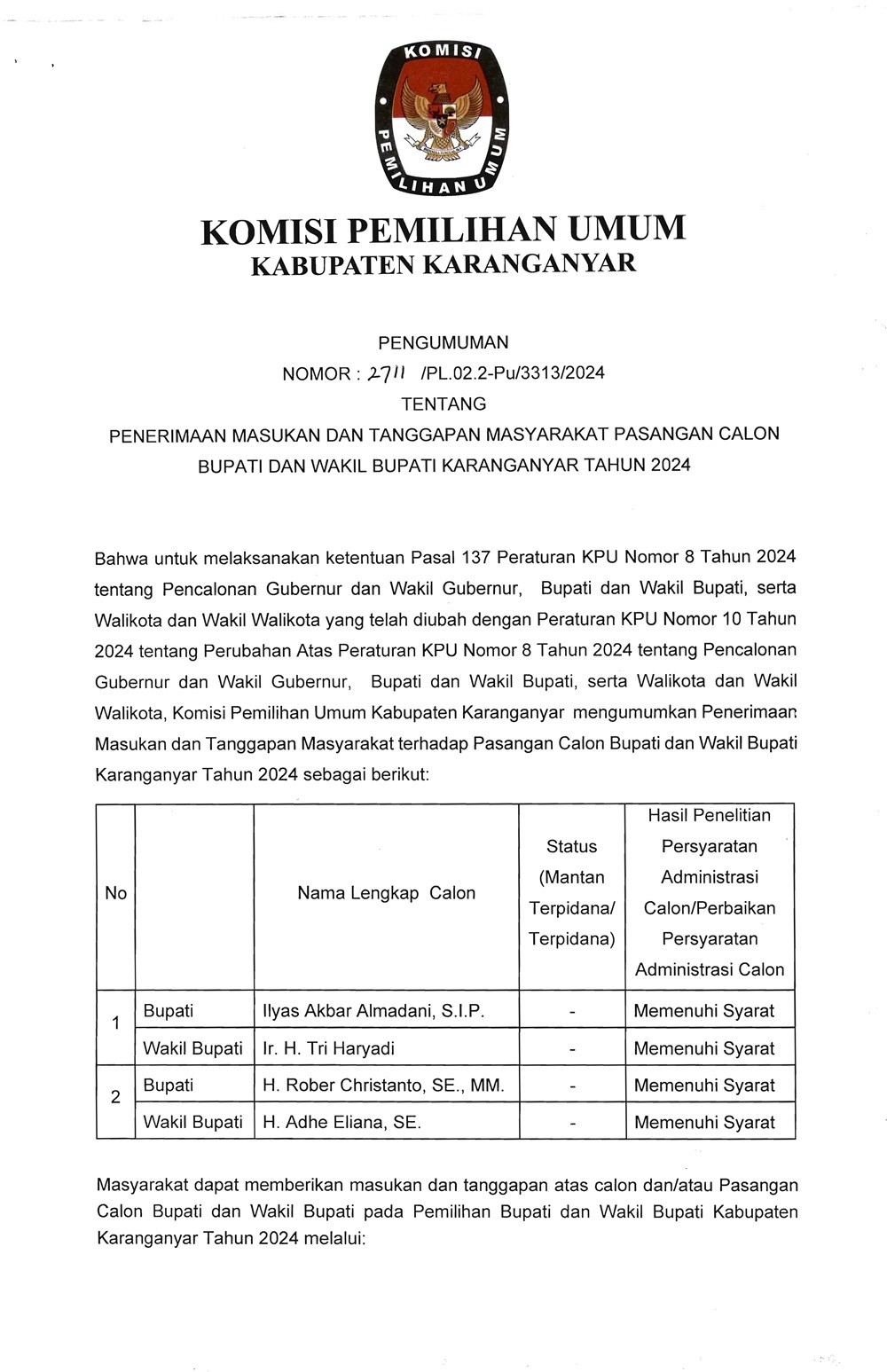 Pengumuman Tentang Penerimaan Masukan dan Tanggapan Masyarakat Terhadap Pasangan Calon Bupati dan Wakil Bupati Karanganyar Tahun 2024 Sabtu, 14 September 2024 13:00 105 DOWNLOAD PENGUMUMAN Bagikan: Telah dilihat 105 kali
