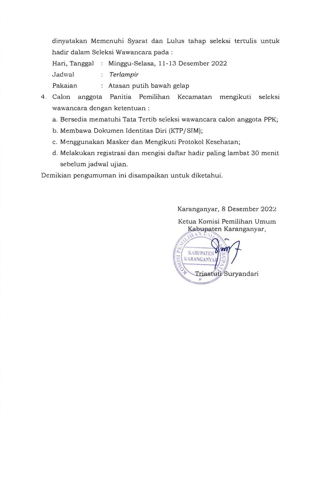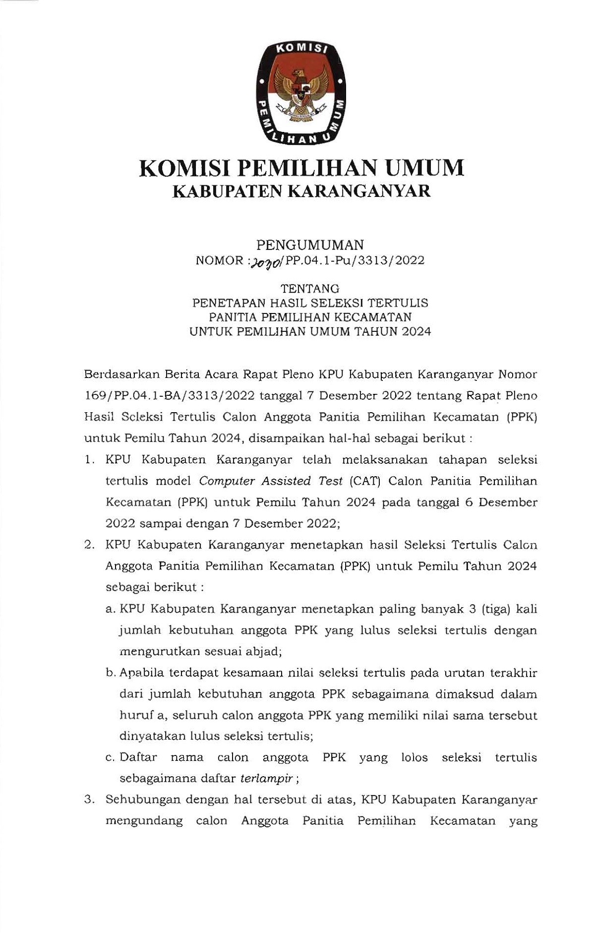 PENGUMUMAN TENTANG PENETAPAN HASIL SELEKSI TERTULIS PANITIA PEMILIHAN KECAMATAN UNTUK PEMILU 2024 Kamis, 08 Desember 2022 00:00 967 DOWNLOAD PENGUMUMAN Bagikan: Telah dilihat 967 kali