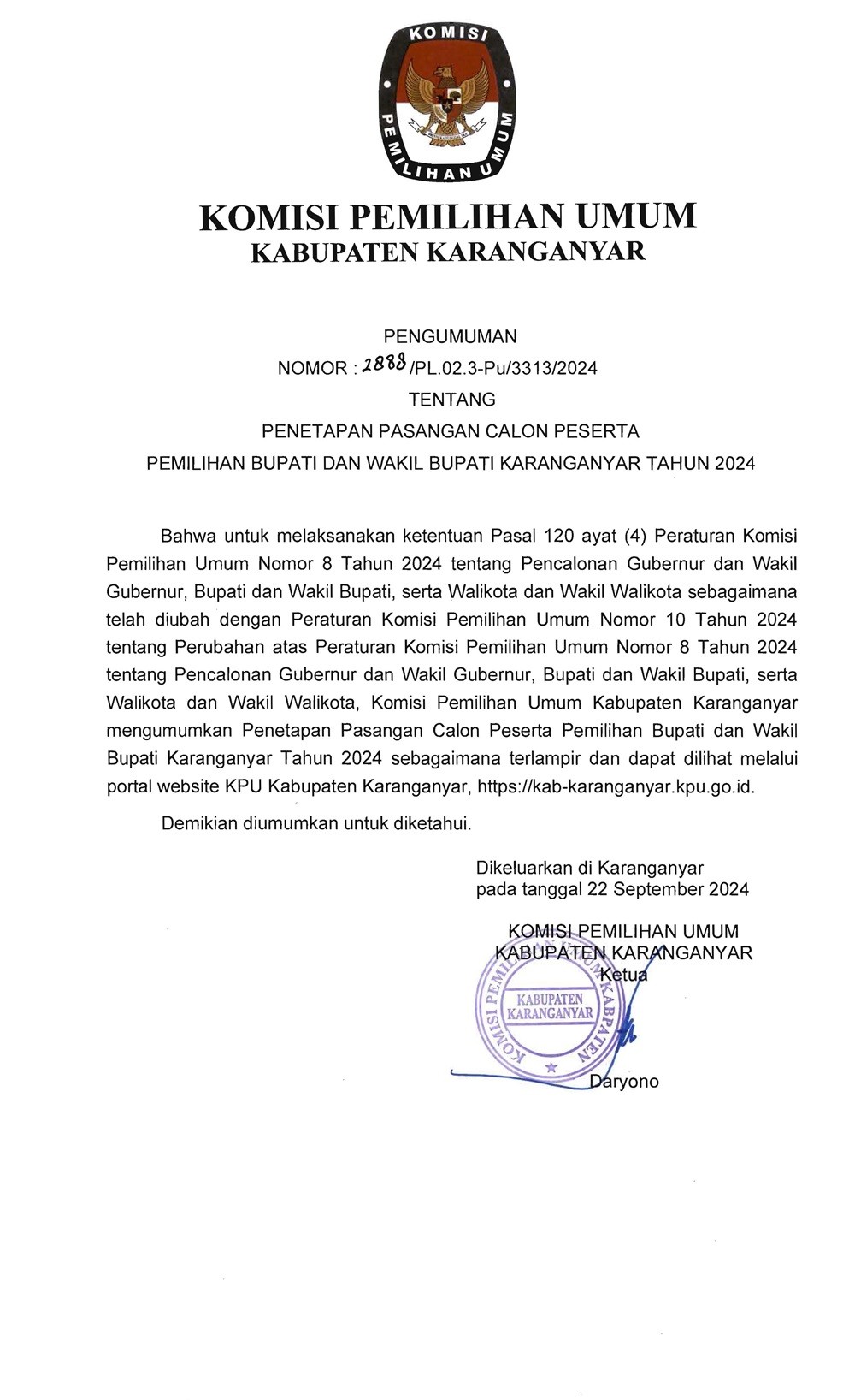 Pengumuman tentang Penetapan Pasangan Calon Peserta Pemilihan Bupati dan Wakil Bupati Karanganyar Tahun 2024 Minggu, 22 September 2024 20:00 140 DOWNLOAD PENGUMUMAN Bagikan: Telah dilihat 140 kali