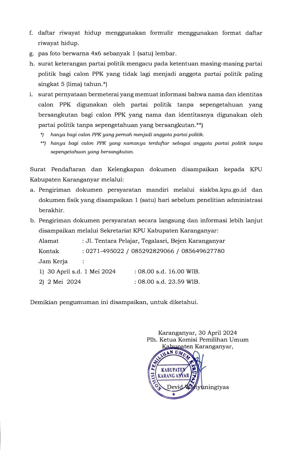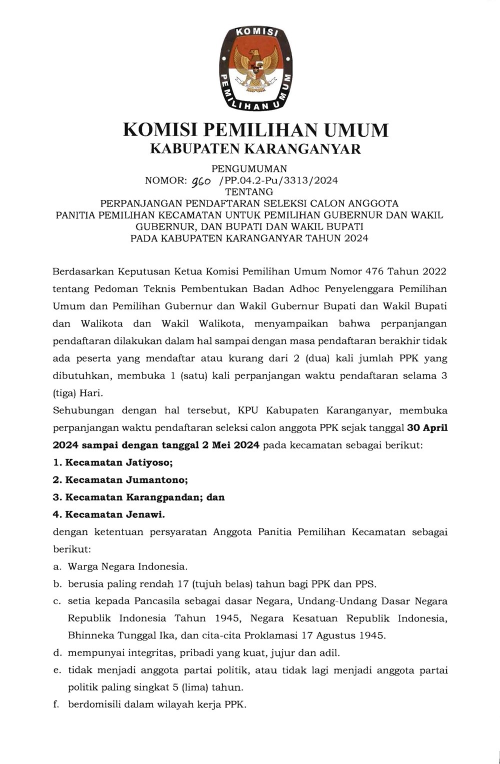 PENGUMUMAN TENTANG PERPANJANGAN SELEKSI CALON ANGGOTA PPK UNTUK PEMILIHAN GUBERNUR DAN WAKIL GUBERNUR, DAN BUPATI DAN WAKIL BUPATI PADA KABUPATEN KARANGANYAR TAHUN 2024 Selasa, 30 April 2024 07:00 91 DOWNLOAD PENGUMUMAN Bagikan: Telah dilihat 91 kali