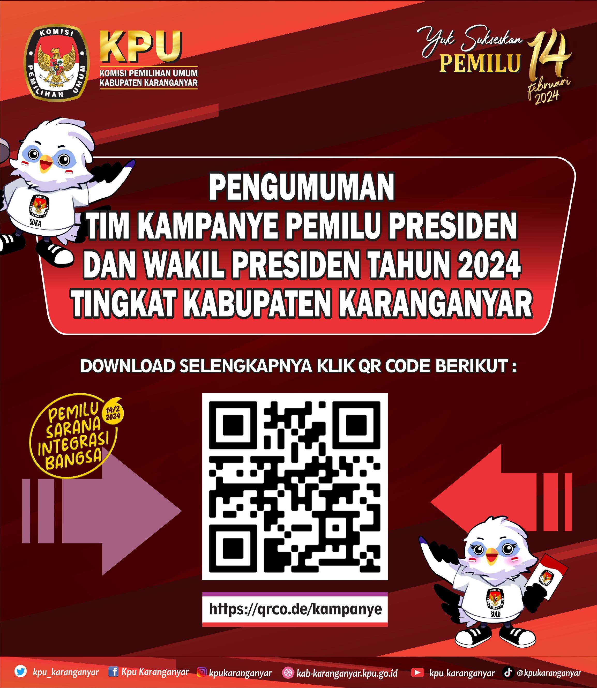 PENGUMUMAN TENTANG TIM KAMPANYE PEMILU PRESIDEN DAN WAKIL PRESIDEN TAHUN 2024 TINGKAT KABUPATEN KARANGANYAR Senin, 04 Desember 2023 07:00 132 Pengumuman selengkapnya Download Disini Bagikan: Telah dilihat 132 kali