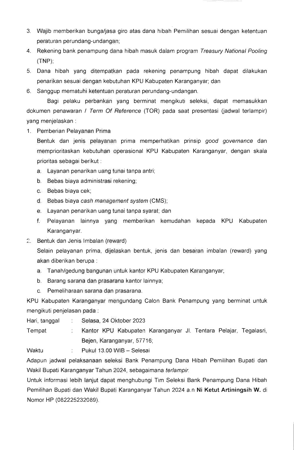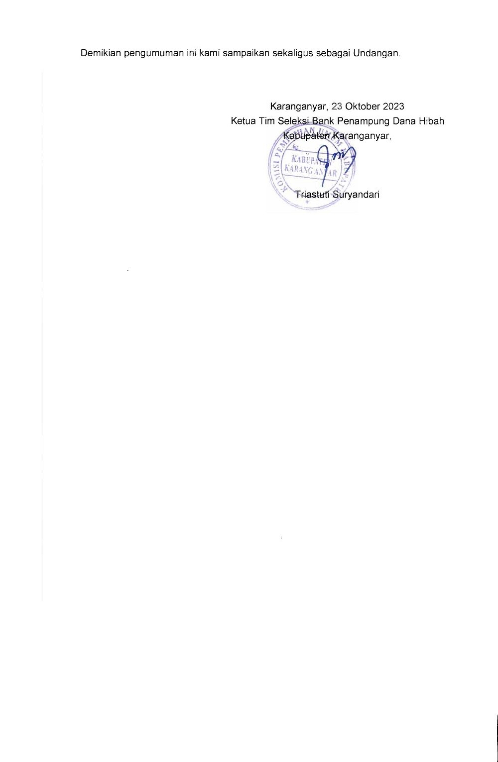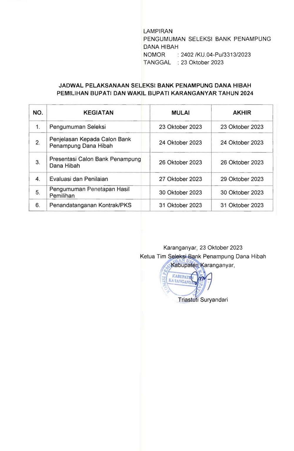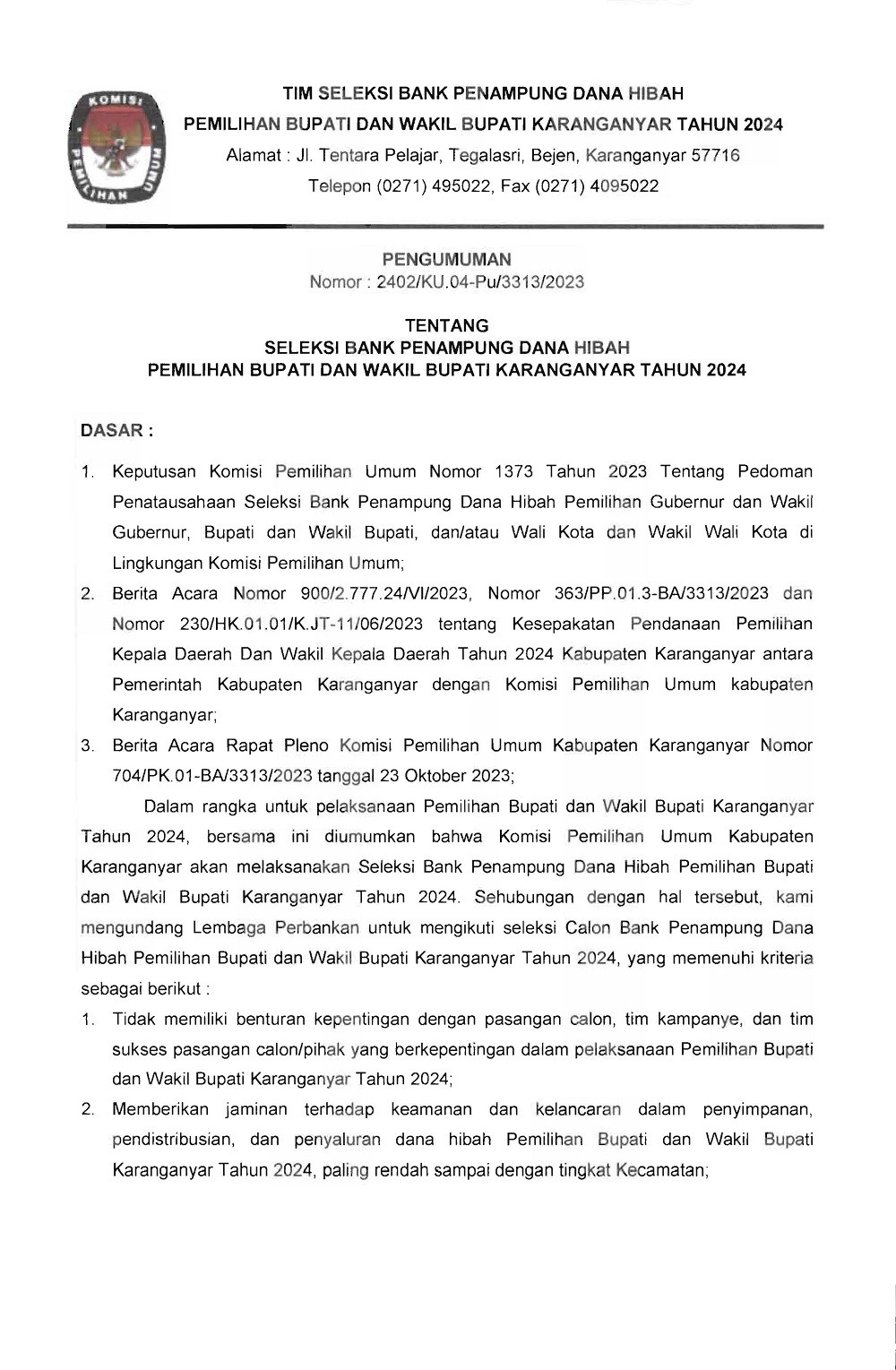 PENGUMUMUMAN SELEKSI BANK PENAMPUNG DANA HIBAH PEMILIHAN BUPATI DAN WAKIL BUPATI KARANGANYAR TAHUN 2024 Senin, 23 Oktober 2023 15:05 87 DOWNLOAD PENGUMUMAN Bagikan: Telah dilihat 87 kali