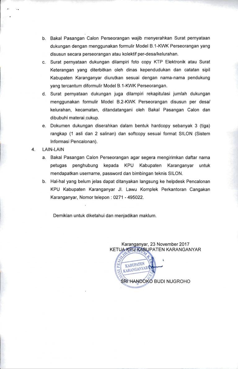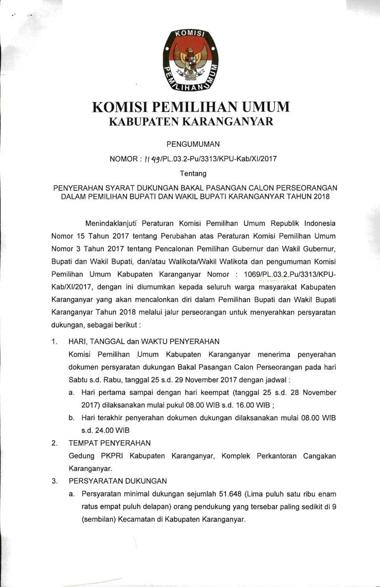 Penyerahan Syarat Dukungan Bakal Pasangan Calon Perseorangan Kamis, 23 November 2017 00:00 32 DOWNLOAD Bagikan: Telah dilihat 32 kali
