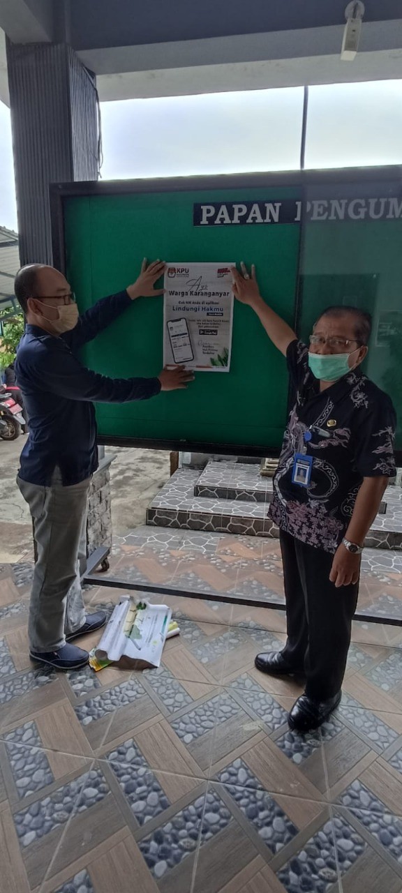Pada kesempatan tersebut, KPU Karanganyar melakukan sosialisasi aplikasi Lindungi Hakmu pada pengguna Smartrphone android yang dapat di unduh di playstore serta menyerahkan poster yang berisi ajakan untuk warga agar pro aktif mengecek apakah sudah terdaftar sebagai pemilih atau belum. (NKAW)