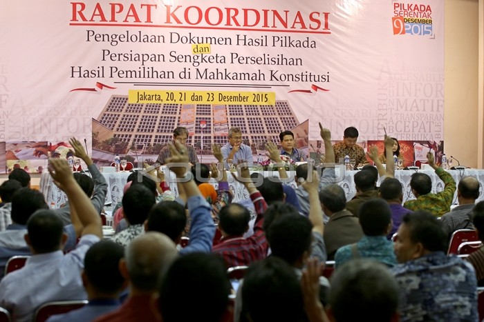 Jakarta, kpu.go.id Pemilihan Gubernur dan Wakil Gubernur, Bupati dan Wakil Bupati, Walikota dan Wakil Walikota Serentak Tahun 2015 telah terselenggara tanggal 9 Desember 2015 yang lalu. Ditengah proses rekapitulasi yang sedang berlangsung, KPU juga harus bersiap diri dalam menghadapi sengketa Perselisihan Hasil Pilkada (PHP) di Mahkamah Konstitusi (MK). Untuk itu, KPU menggelar Rapat Koordinasi (Rakor) Pengelolaan data dan Persiapan Sengketa PHP, Minggu (20/12) di Ruang Sidang Utama Lantai 2 KPU RI.