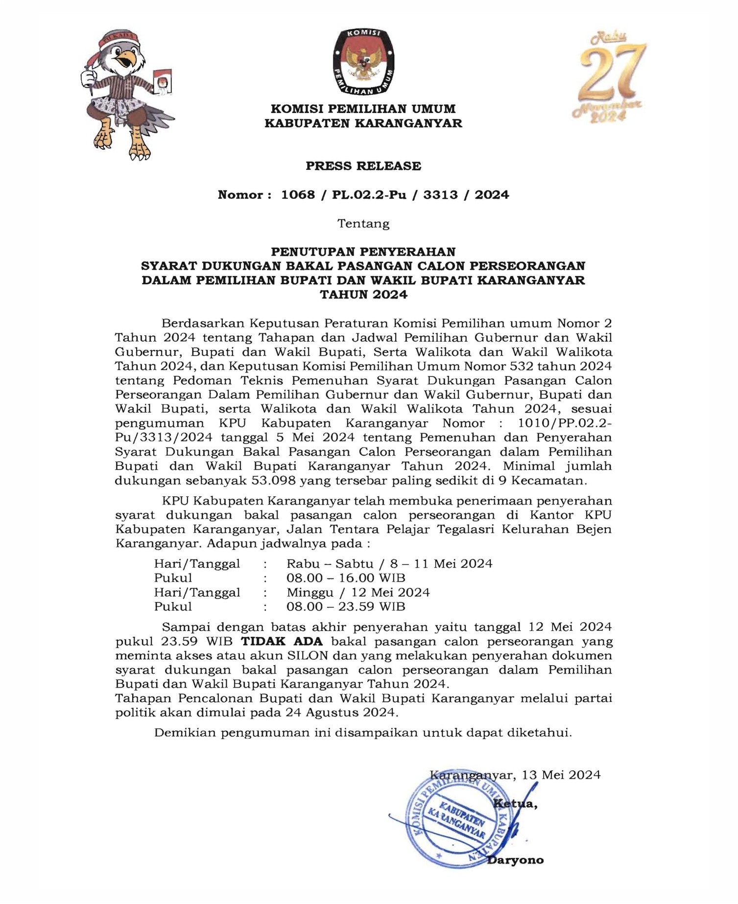 Press Release Nomor : 1068/ PL.02.2-Pu/ 3313/ 2024 tentang Penutupan Penyerahan Syarat Dukungan Bakal Calon Perseorangan dalam Pemilihan Bupati dan Wakil Bupati Karanganyar Tahun 2024.