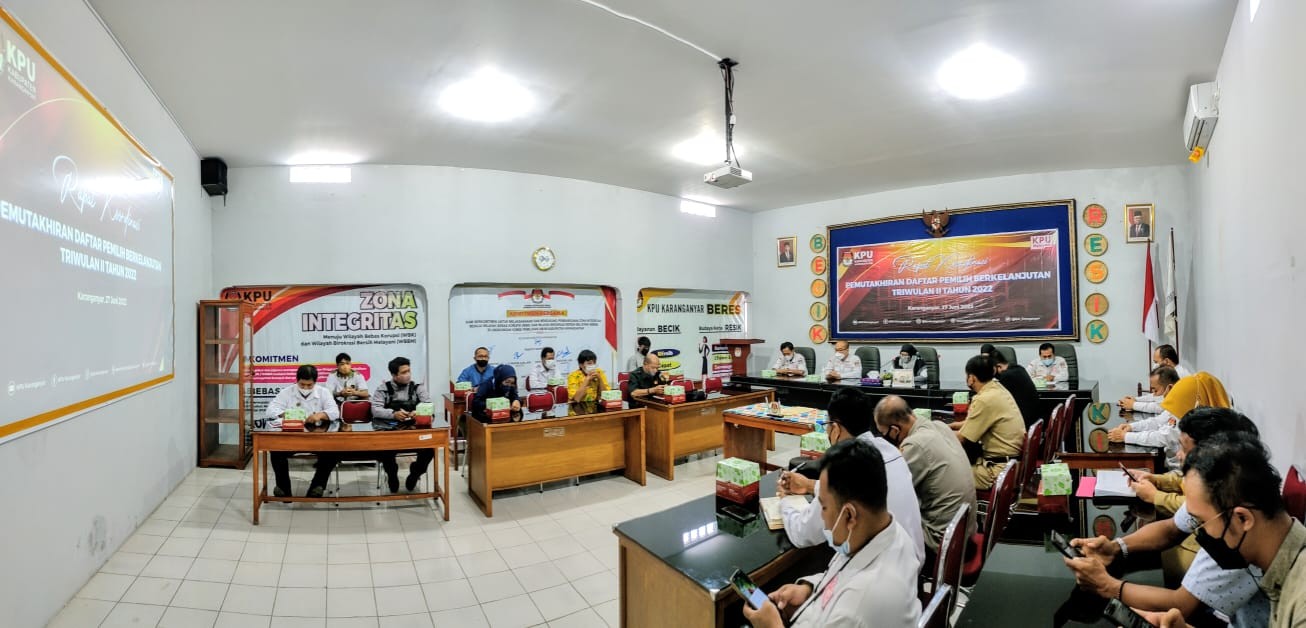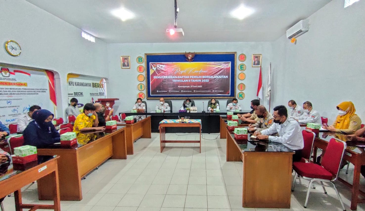 KARANGANYAR - KPU Karanganyar terus melakukan Pemutakhiran Data Pemilih Berkelanjutan. Periode Juni ini memasuki triwulan kedua tahun 2022, KPU Karanganyar menggelar Rapat Koordinasi Pemutakhiran Data Pemilih Berkelanjutan (PDPB), Senin (27/06/2022). Bertempat di kantor KPU Karanganyar, jumlah pemilih untuk bulan Juni 2022 sebanyak 675.119 dengan rincian pemilih laki-laki sebanyak 333.172 dan pemilih perempuan sebanyak 341.947.