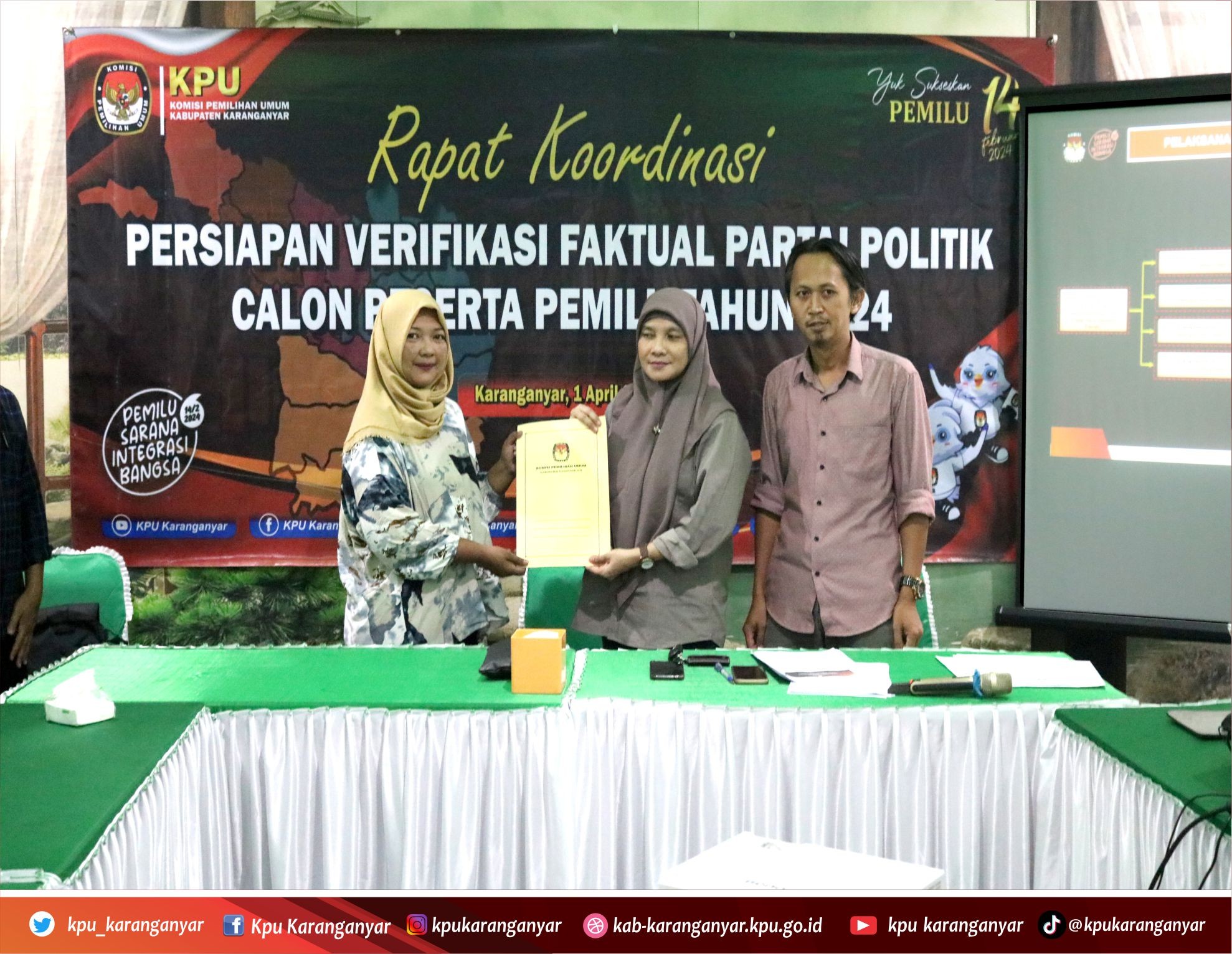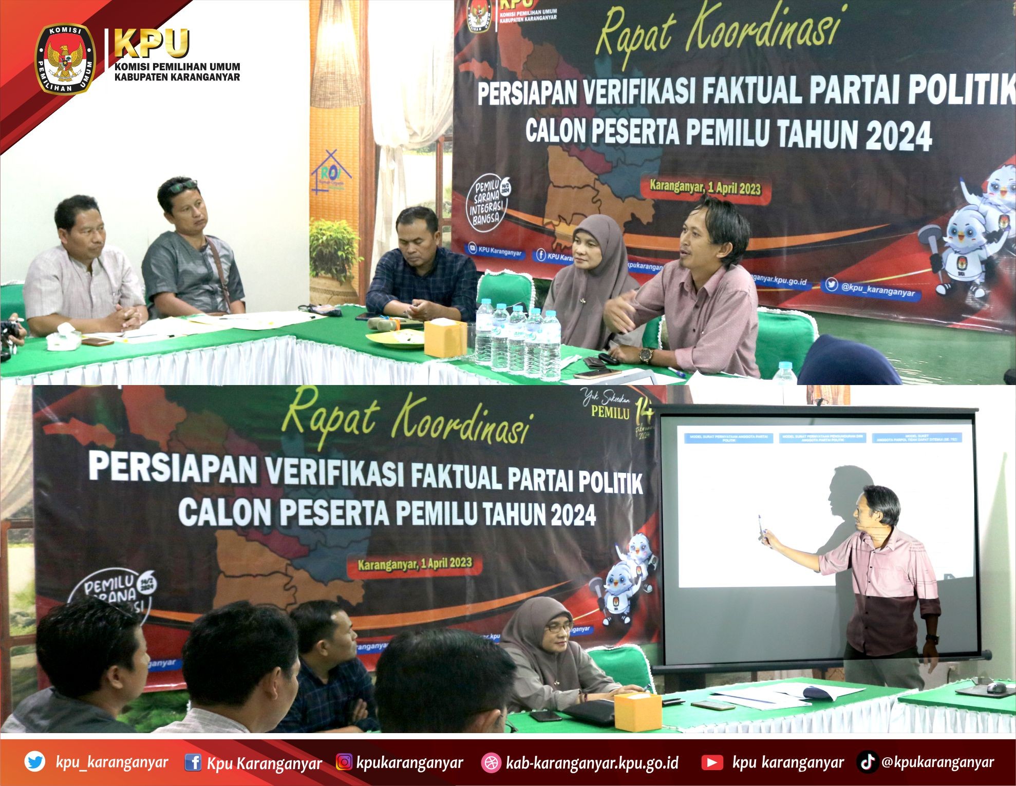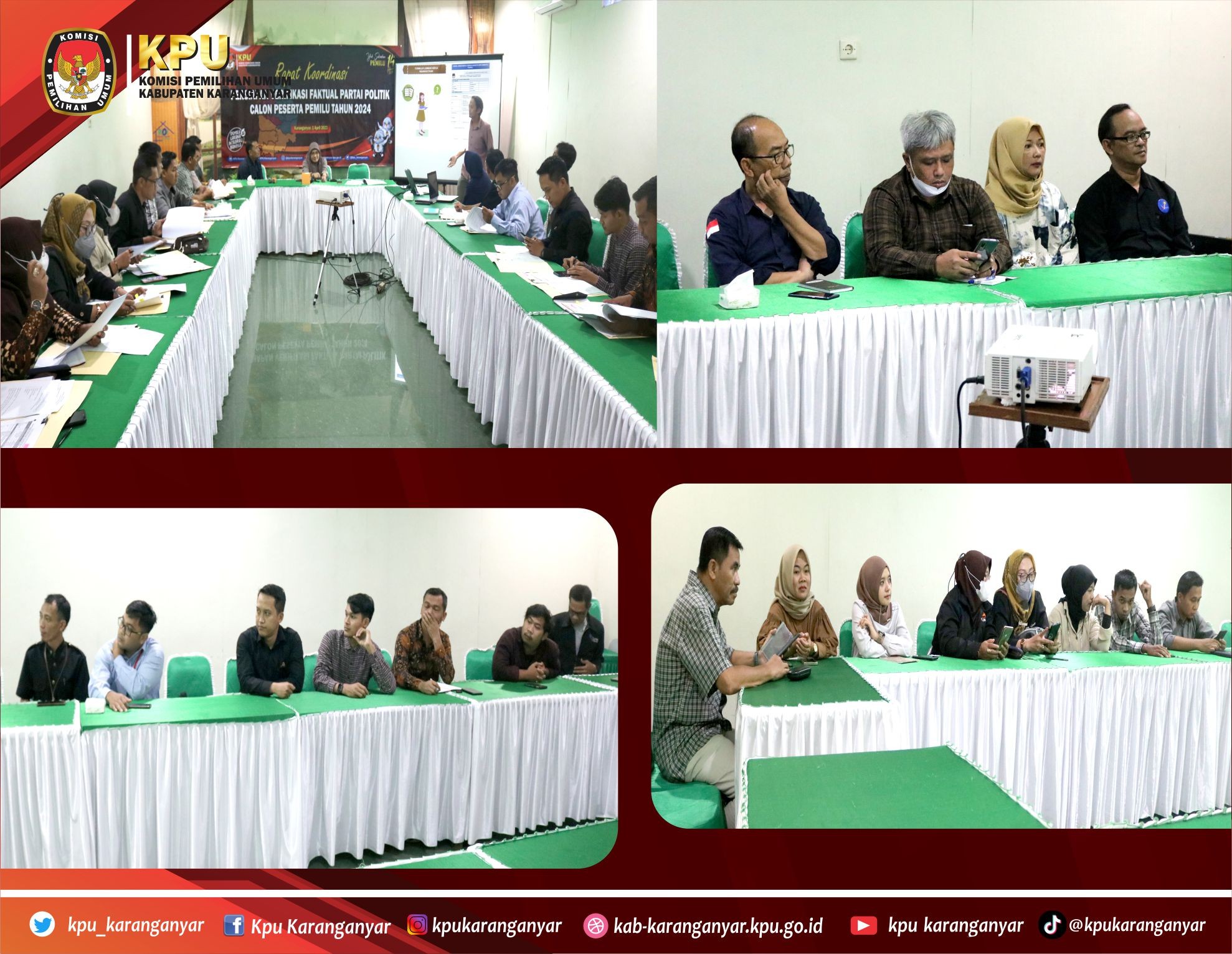 KPU Karanganyar menyelenggarakan Rakor Persiapan Verifikasi Faktual Partai Politik Calon Peserta Pemilu 2024 (Green Resto, 1 April 2023)