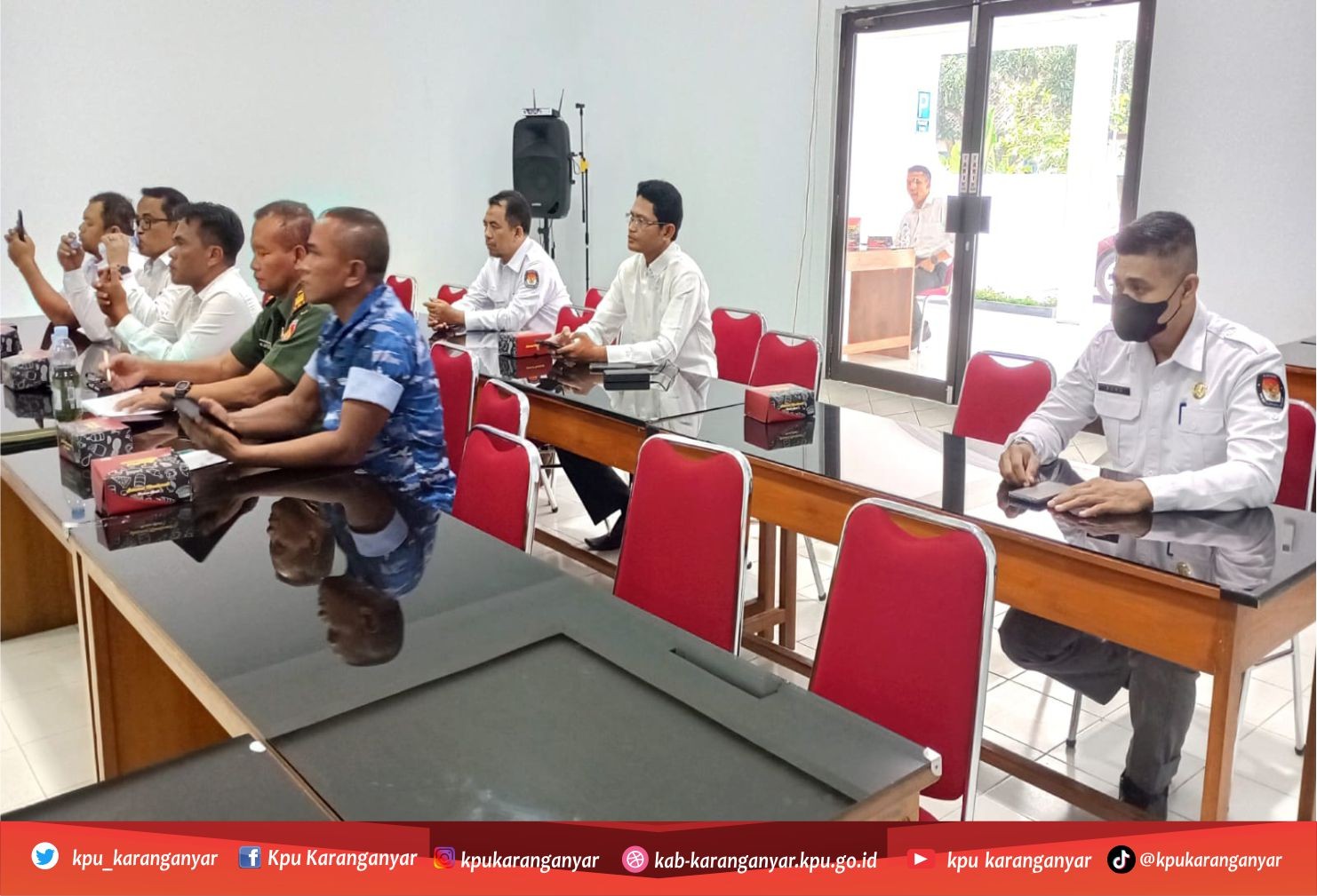 KPU Kabupaten Karanganyar gelar acara Rapat Koordinasi Penyusunan Daftar Pemilih Tetap (DPT) Pemilu Tahun 2024 di aula Kantor KPU Kabupaten Karanganyar. Rapat Koordinasi dihadiri oleh sejumlah dinas / instansi terkait antara lain, Polres Karanganyar, Kodim 0727 Karanganyar, Disdukcapil Kabupaten Karanganyar, Badan Kesbangpol Kabupaten Karanganyar, Lanud Adi Soemarmo Karanganyar, dan Bawaslu Kabupaten Karanganyar, Senin (19 Juni 2023)