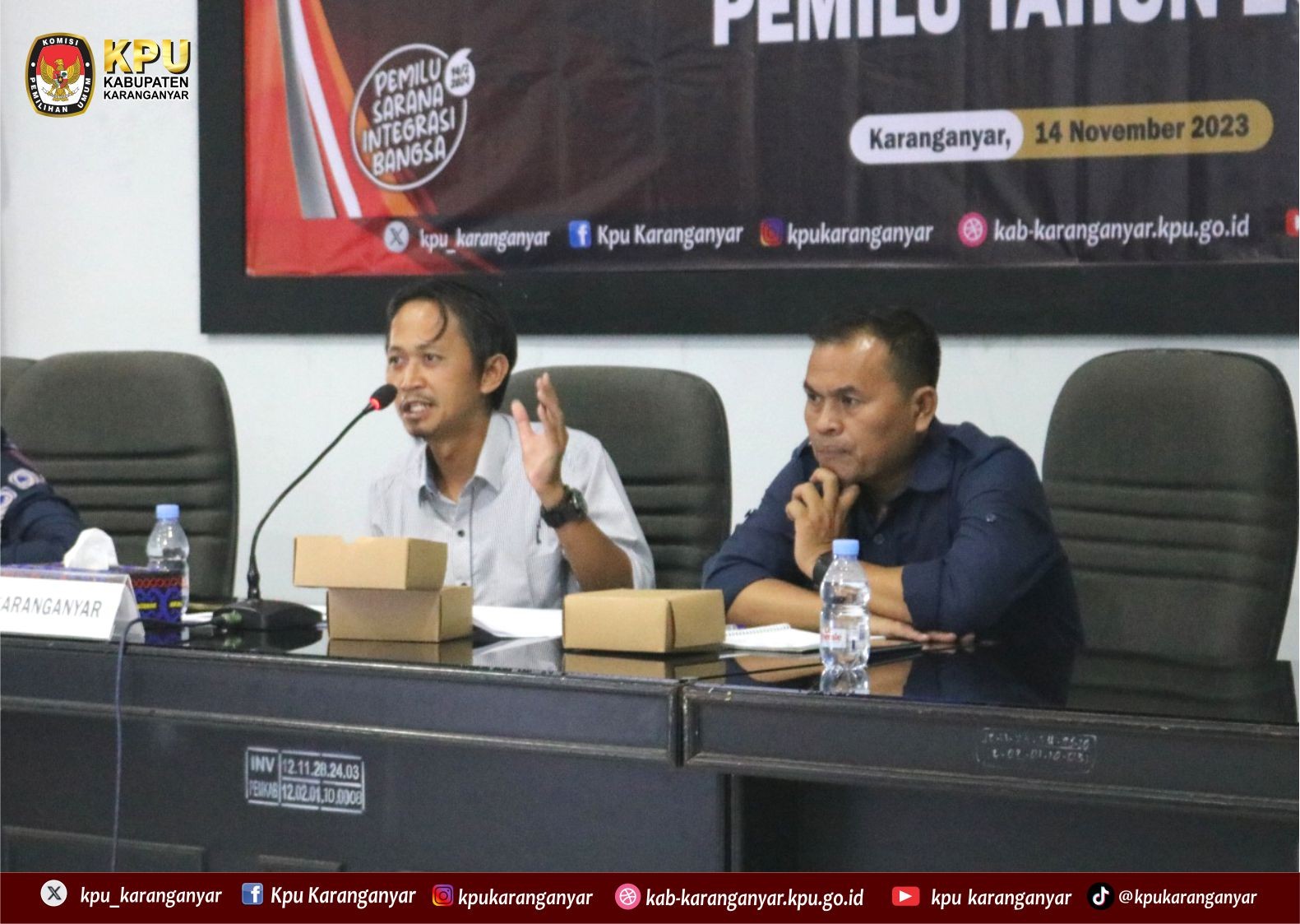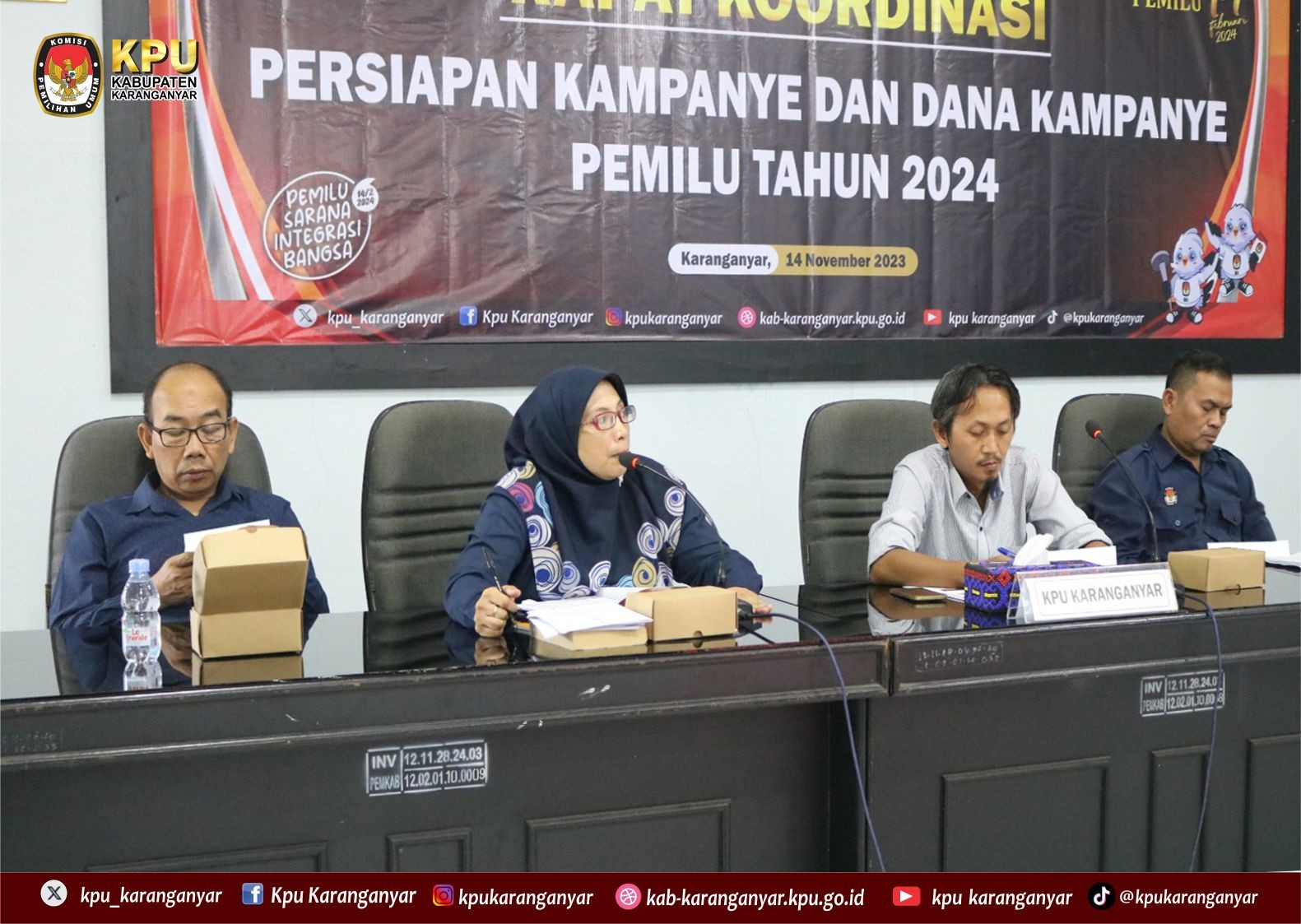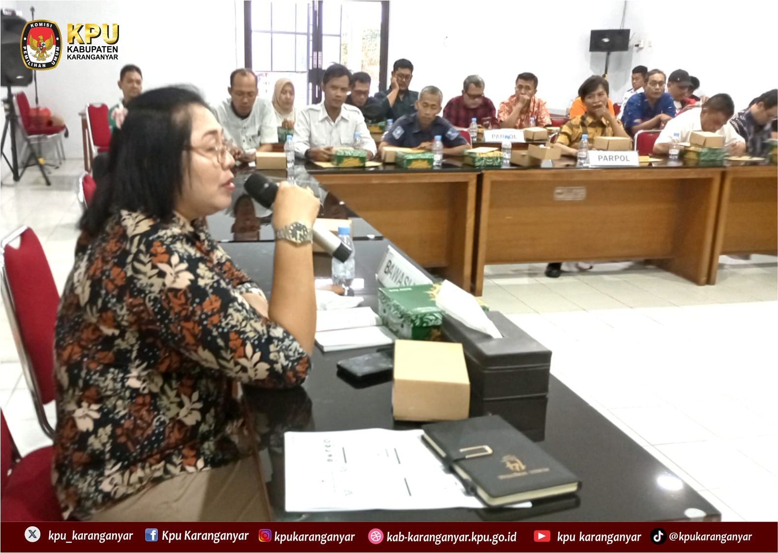 KPU Kabupaten Karanganyar Menyelenggarakan Rapat Koordinasi Persiapan Kampanye dan Dana Kampanye untuk Pemilu Serentak Tahun 2024 bersama Parpol, Kesbangpol, dan Dinas Instansi terkait (Selasa, 14 November 2023).