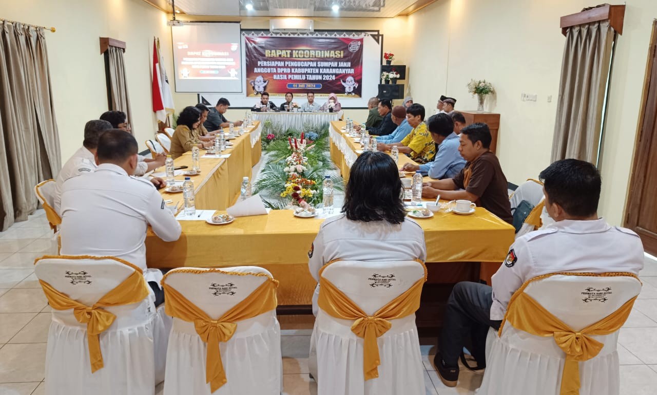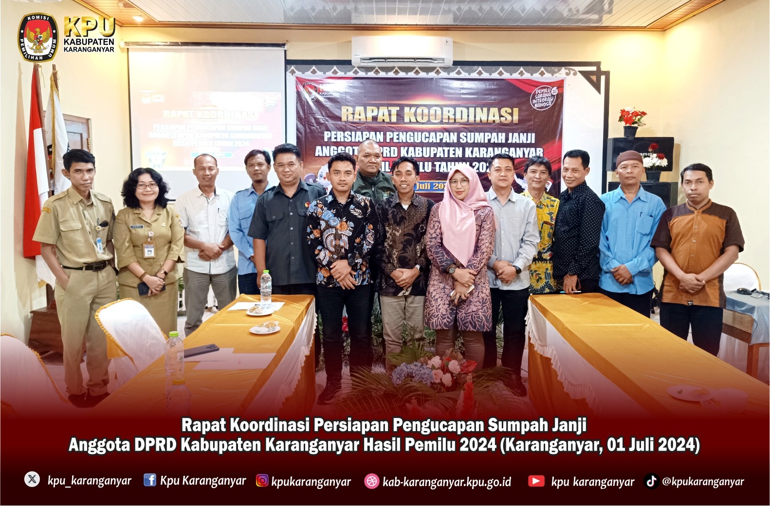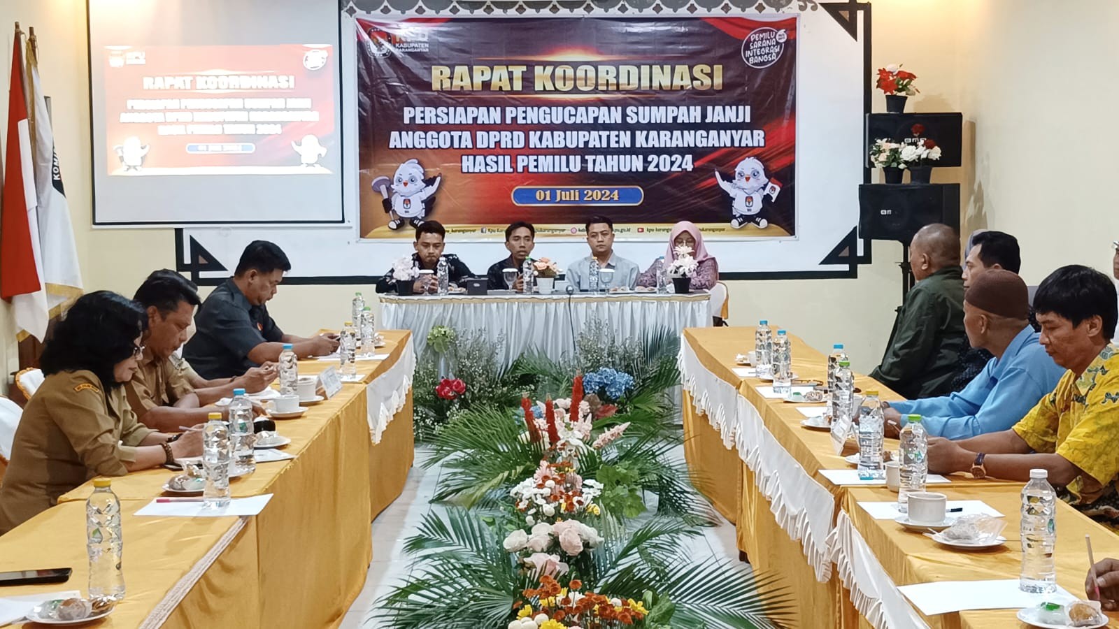 KPU Kabupaten Karanganyar menyelenggarakan Rapat Koordinasi Persiapan Pengucapan Sumpah Janji Anggota DPRD Kabupaten Karanganyar Hasil Pemilu 2024 pada Senin (01/07/2024) di Hotel Permatasari Karanganyar.