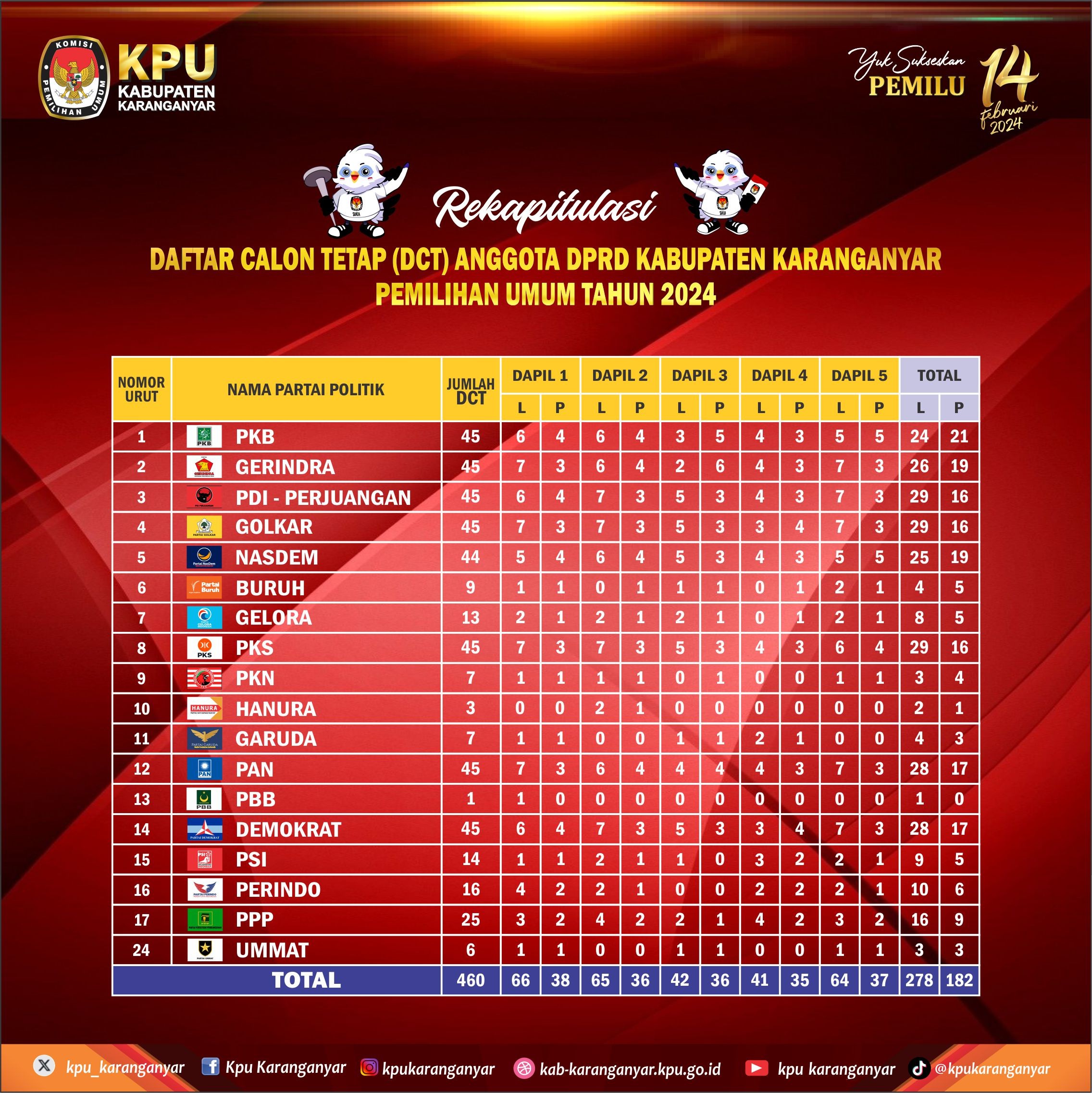Rekapitulasi Daftar Calon Tetap (DCT) Anggota DPRD Kabupaten Karanganyar Pemilu 2024.