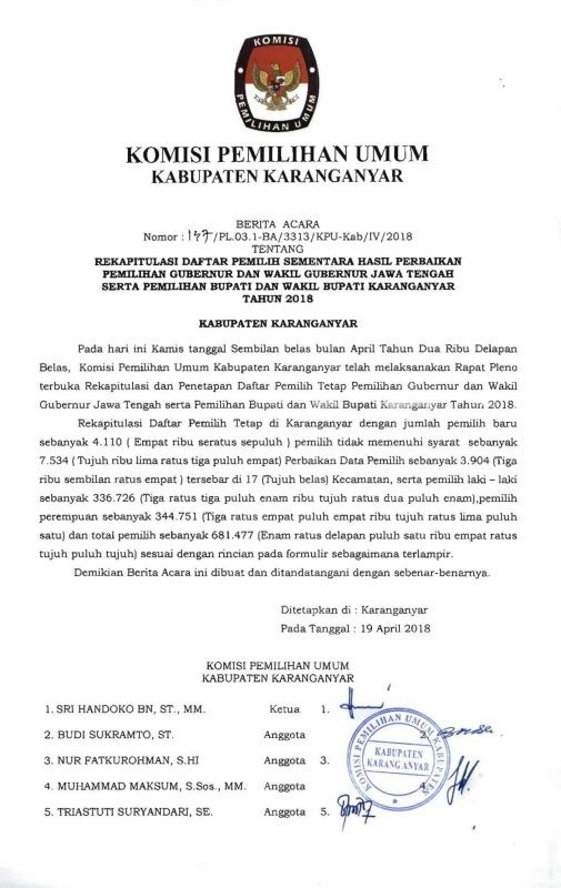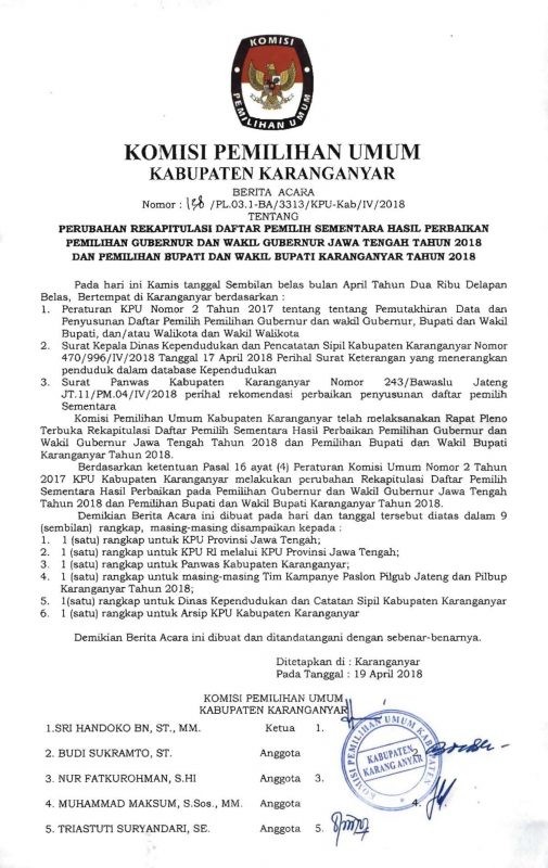 REKAPITULASI DPT PEMILIHAN GUBERNUR DAN WAKIL GUBERNUR JAWA TENGAH SERTA PEMILIHAN BUPATI DAN WAKIL BUPATI KARANGANYAR TAHUN 2018