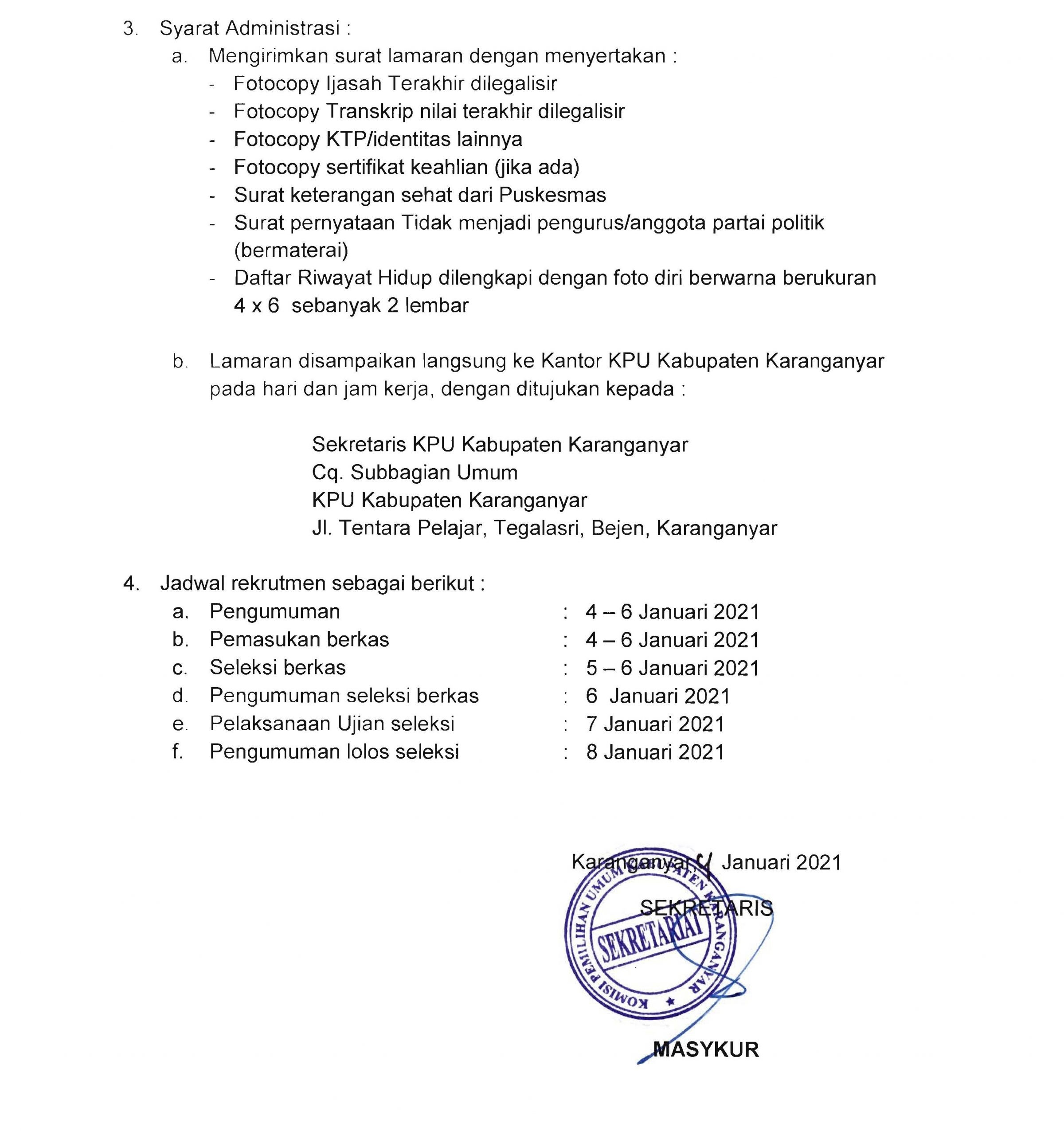 Rekrutmen Tenaga Pendukung (Pegawai Non PNS) KPU Kab. Karanganyar Tahun 2021 Senin, 04 Januari 2021 00:00 131 DOWNLOAD Bagikan: Telah dilihat 131 kali