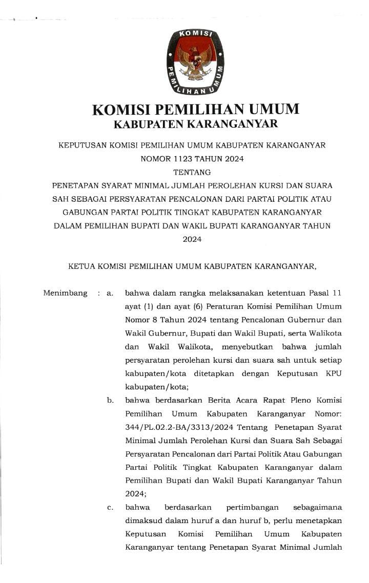 Salinan SK No. 1123 Th. 2024 Tentang Penetapan Syarat Minimal Jumlah Perolehan Kursi dan Suara Sah sebagai Persyaratan Pencalonan dari Partai Politik atau Gabungan Partai Politik tingkat Kabupaten Karanganyar dalam Pemilihan Bupati dan Wakil Bupati Karanganyar Tahun 2024