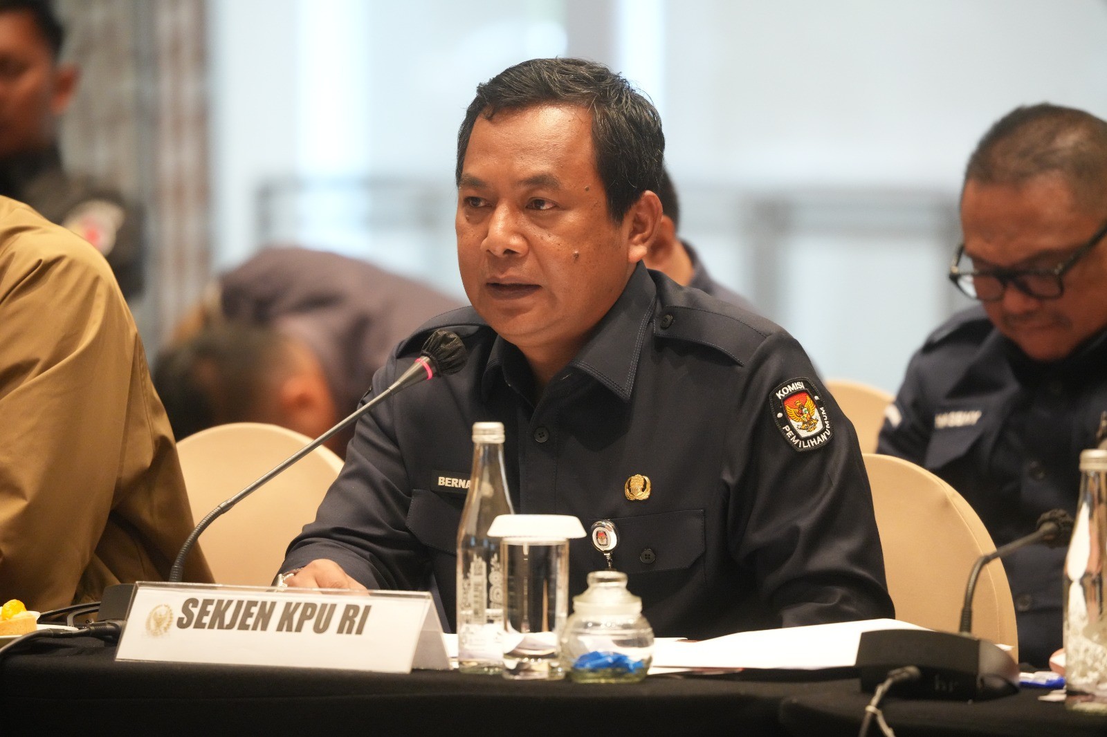 Jakarta, kpu.go.id- Sekretaris Jenderal KPU Bernad Dermawan Sutrisno hadir dalam Konsinyering KPU dan Bawaslu bersama Komisi II DPR RI dengan agenda Pembahasan RKA K/L Tahun Anggaran 2025 Berdasarkan Pagu Anggaran RAPBN 2025 di Jakarta, Selasa (3/09/2024).