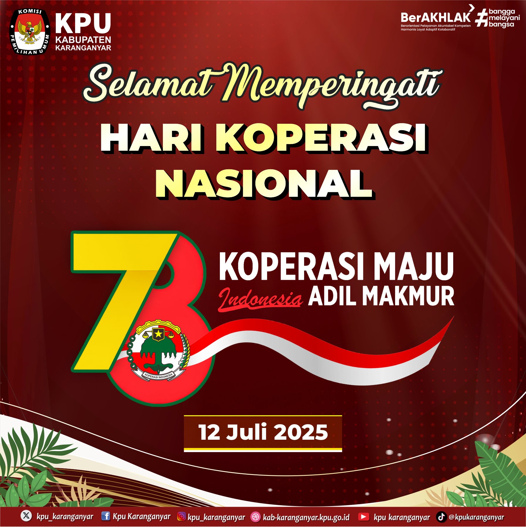 KPU Kabupaten Karanganyar mengucapkan Selamat Hari Koperasi Nasional 2025. Koperasi tumbuh dari rakyat, oleh rakyat, dan untuk kesejahteraan rakyat. “Koperasi Maju, Indonesia Adil Makmur”