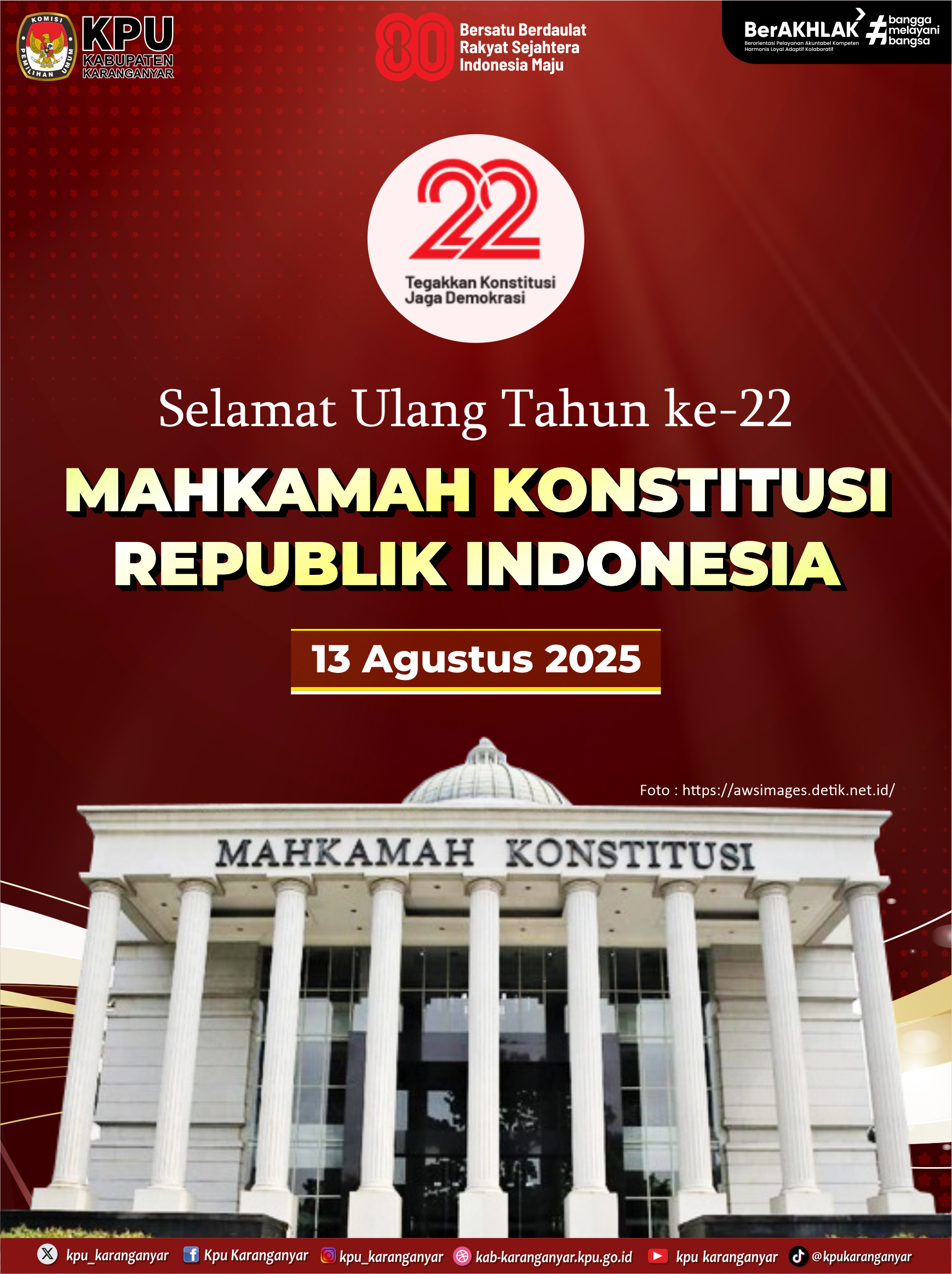KPU Kabupaten Karanganyar mengucapkan selamat ulang tahun ke-22 kepada Mahkamah Konstitusi Republik Indonesia, 13 Agustus 2025 dengan bertemakan "Tegakkan Konstitusi, Jaga Demokrasi”.