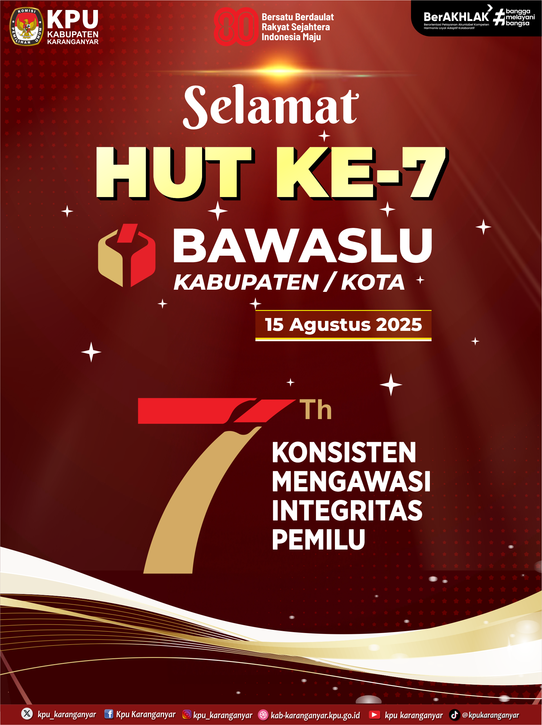 KPU Kabupaten Karanganyar mengucapkan selamat HUT ke-7 Bawaslu Kabupaten / Kota, 15 Agustus 2025.