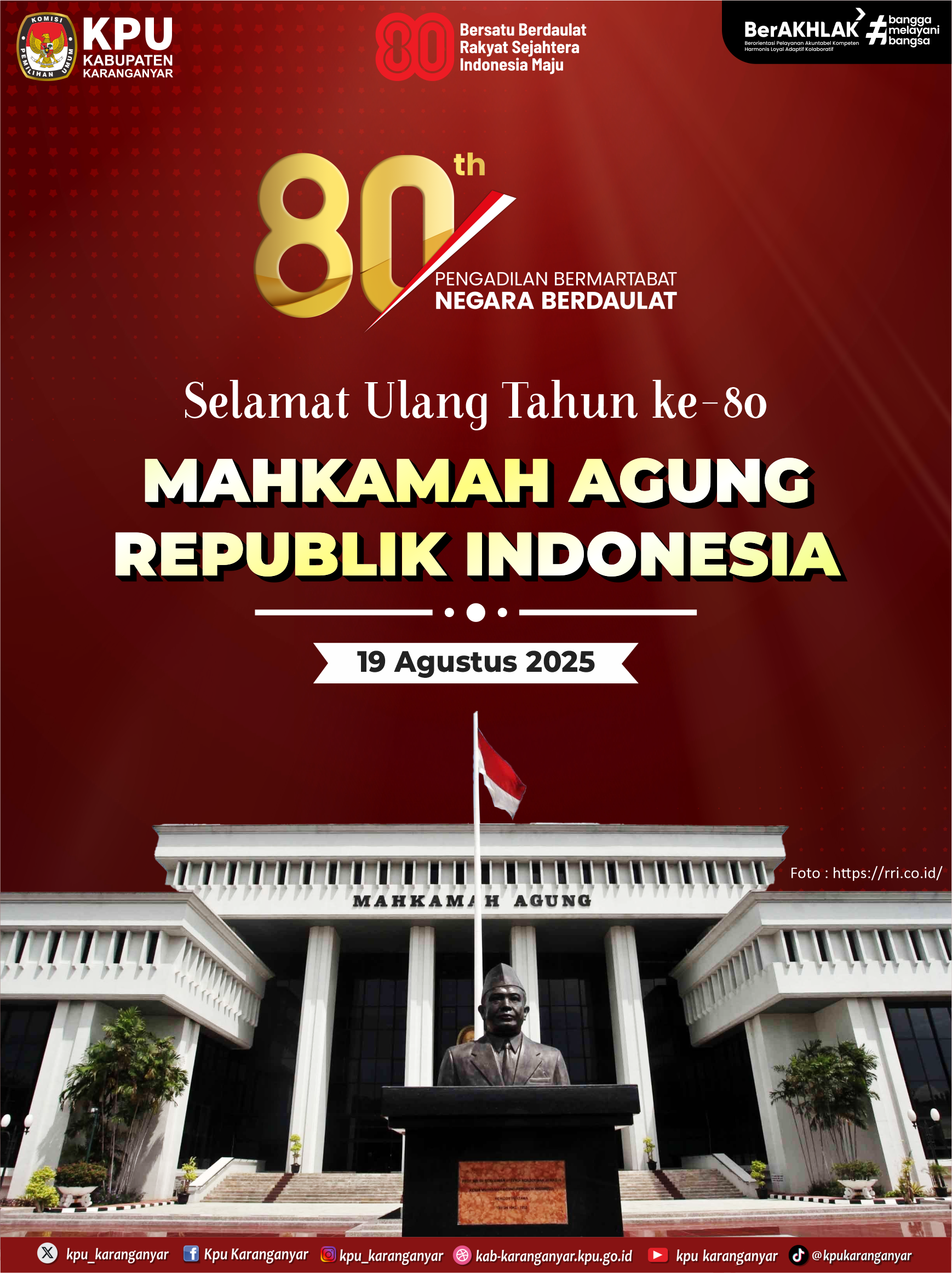 KPU Kabupaten Karanganyar mengucapkan selamat ulang tahun ke-80 kepada Mahkamah Agung Republik Indonesia, 19 Agustus 2025 dengan bertemakan "Pengadilan Bermartabat Negara Berdaulat”.