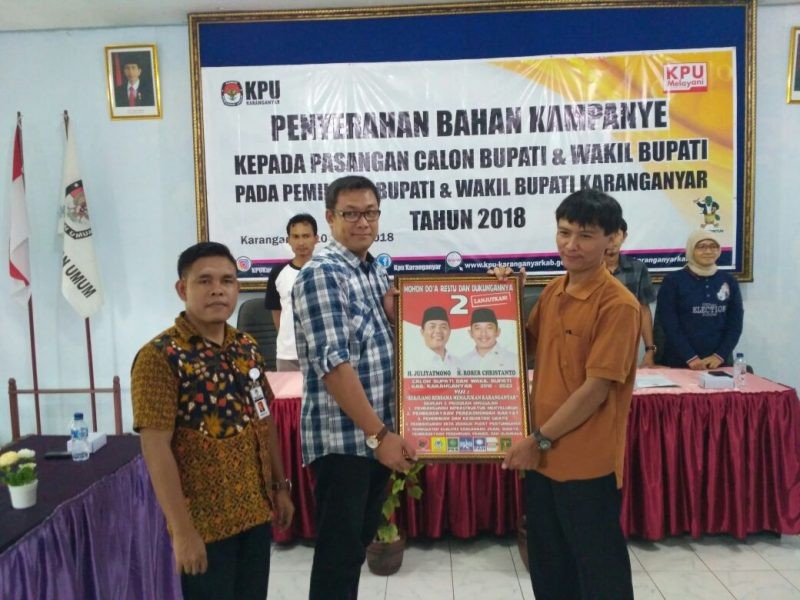 Bahan kampanye tersebut secara simbolik diserahkan oleh Ketua KPU Karanganyar, Sri Handoko Budi Nugroho, kepada masing-masing tim kampanye Paslon dengan disaksikan oleh Panwaskab.
