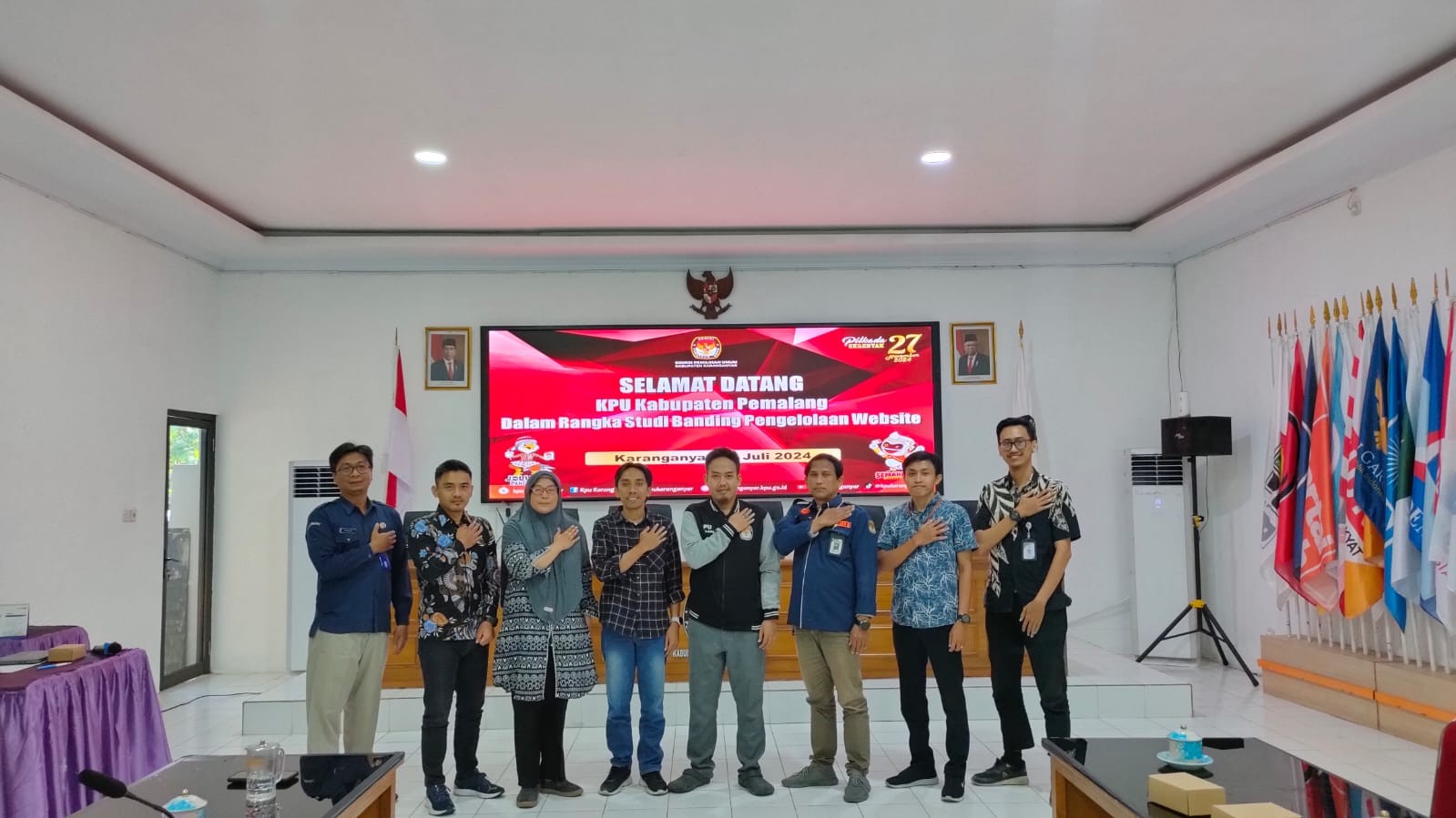 KARANGANYAR - KPU Karanganyar menerima kunjungan KPU Kabupaten Pemalang dalam rangka sharing pengelolaan website dan keterbukaan informasi publik, bertempat di Aula kantor KPU Karanganyar Jalan Tentara Pelajar Tegalasi, Bejen, Karanganyar (27/07/2024).