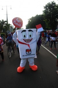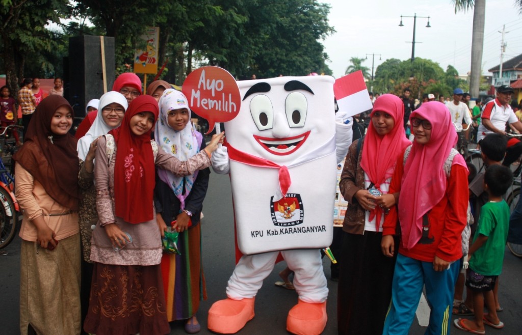 Karanganyar-Minggu (9/2) Si Kora (Maskot Kotak Suara Pemilu 2014) turut ramaikan event Car Free Day (CFD) di Karanganyar. Berwujud Boneka Kotak yang lucu dan membawa papan bertuliskan Ayo Memilih, Si Kora mampu menarik perhatian pengunjung CFD di Karanganyar. Banyak pengunjung CFD di sekitar Alun-alun Karanganyar yang meminta foto bersama Si Kora.