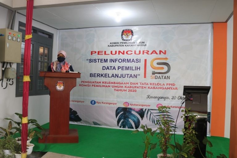 KARANGANYAR – Komisi Pemilihan Umum (KPU) Kabupaten Karanganyar menyelenggarakan Peluncuran Sistem Informasi Data Pemilih Berkelanjutan “SIDATAN” di halaman kantor KPU Karanganyar Jalan Tentara Pelajar, Tegalasri, bejen Karanganyar, Selasa (20/10/2020).