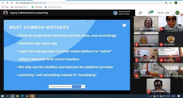 “Di saat inilah KPU harus bisa mengoptimalkan sosial media untuk menyampaikan berbagai informasi tentang KPU baik yang Pilkada maupun yang tidak Pilkada, sehingga terbangun kepercayaan dari pengguna media sosial,” kata Agung Yudha dalam paparannya.