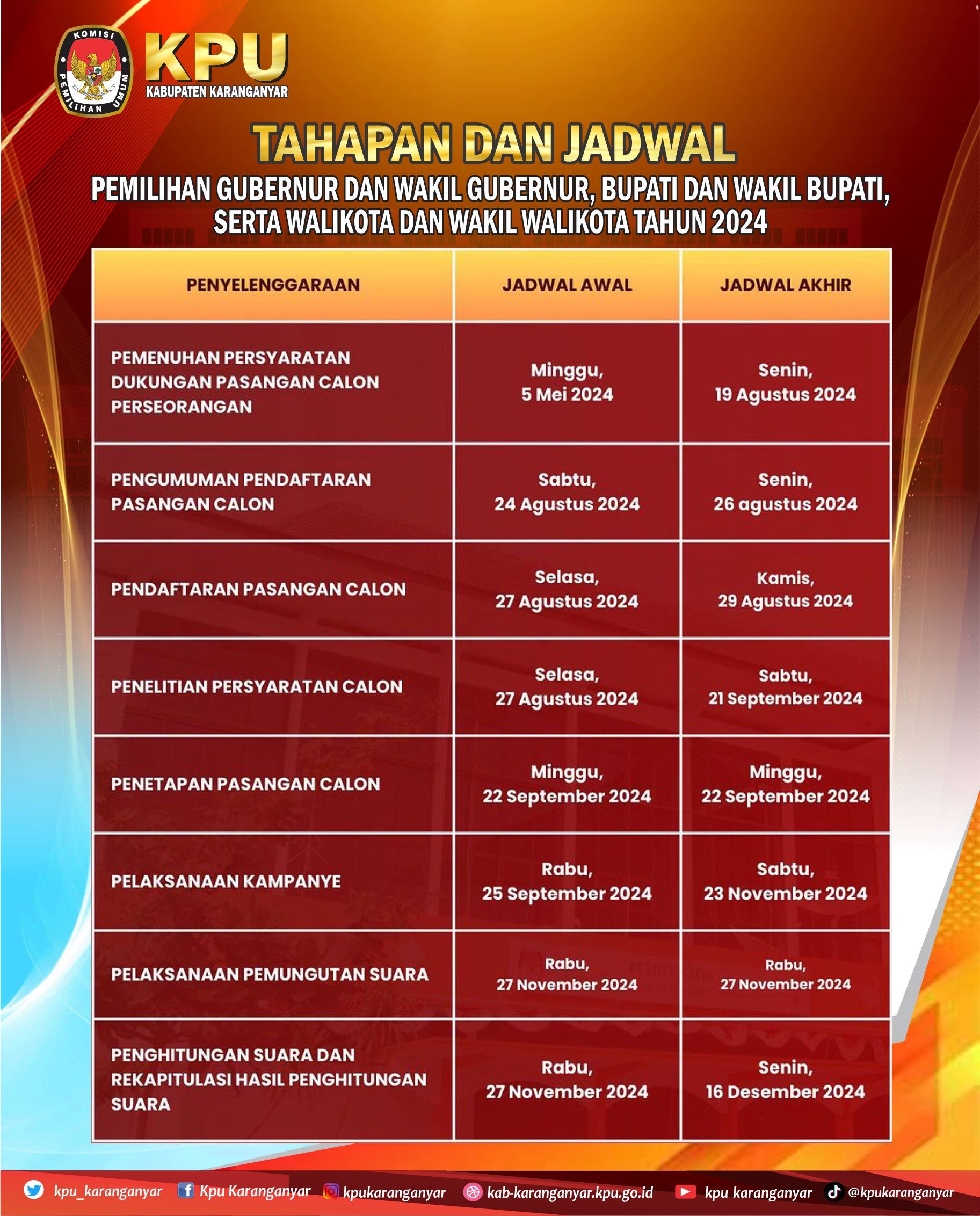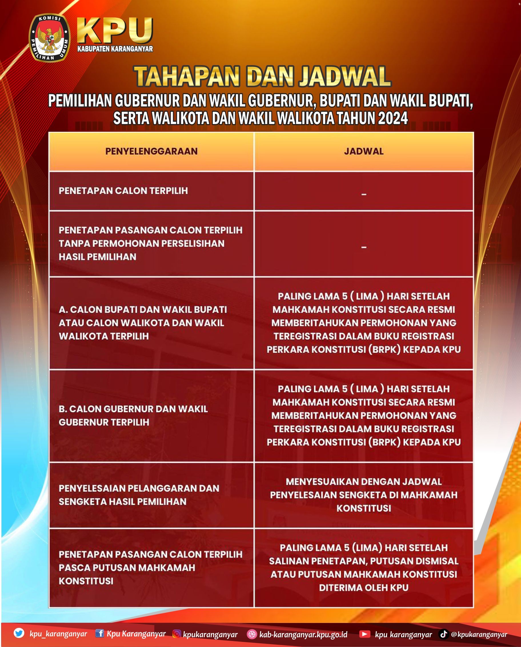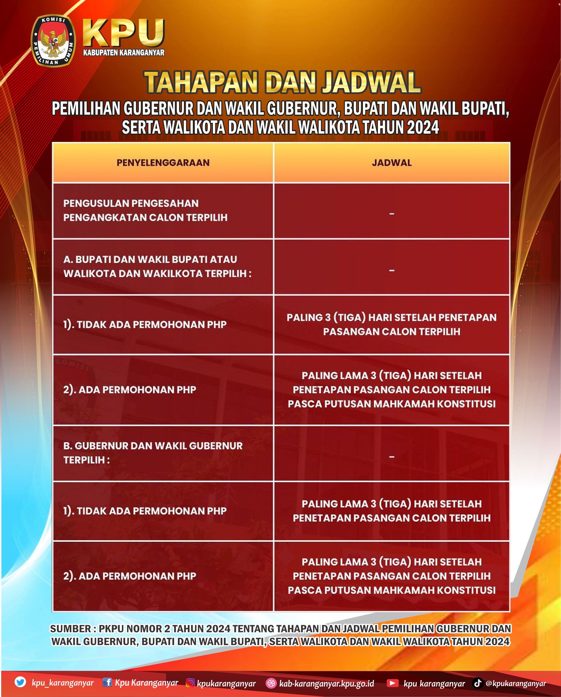 Berikut Tahapan dan Jadwal Pemilihan Gubernur dan Wakil Gubernur, Bupati dan Wakil Bupati, serta Walikota dan Wakil Walikota Tahun 2024. Selengkapnya di postingan ini ya….