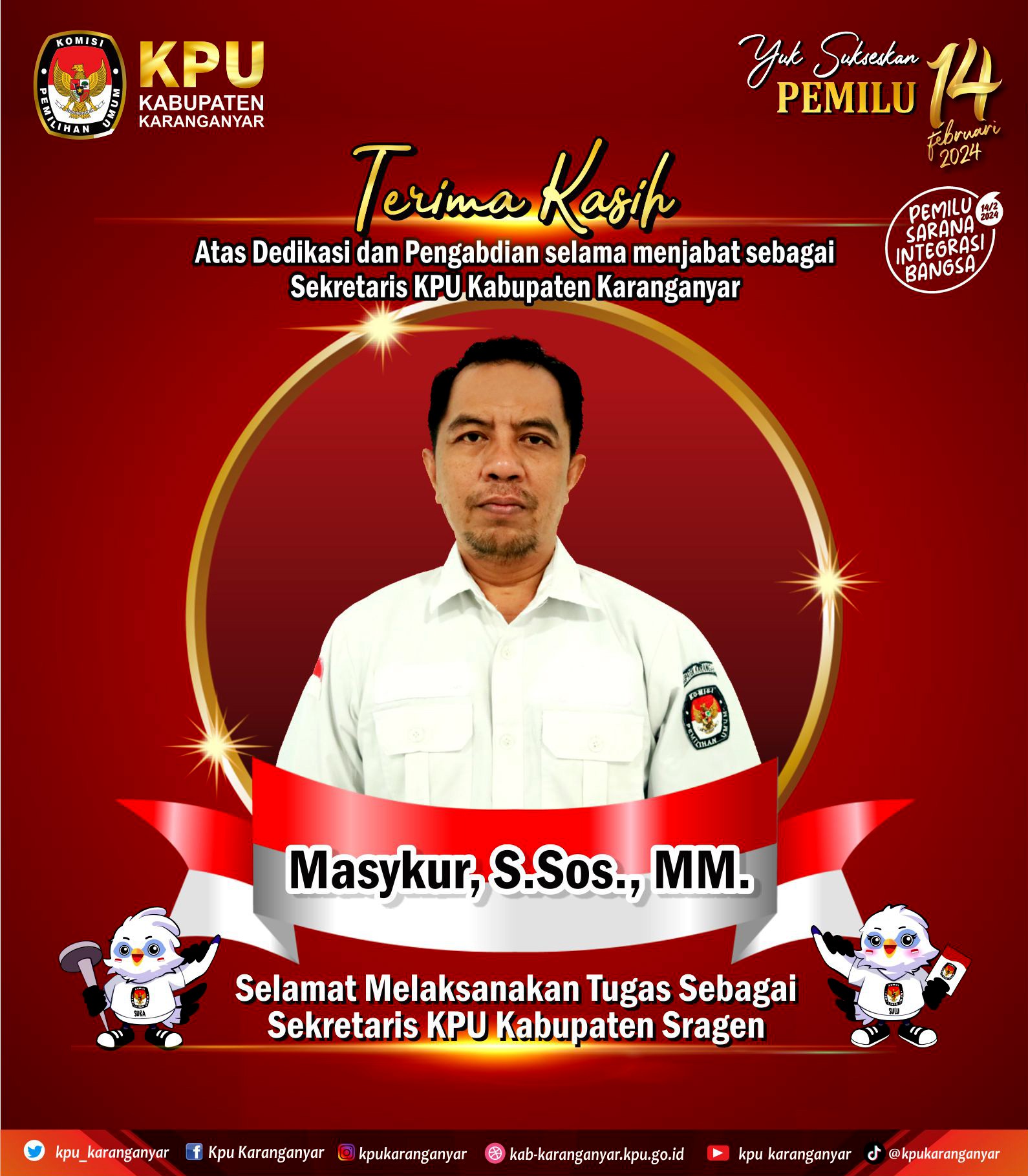 KPU Kabupaten Karanganyar mengucapkan Terima Kasih kepada Masykur, S.Sos., MM. atas dedikasi dan pengabdian selama menjabat sebagai Sekretaris di KPU Kabupaten Karanganyar dan juga mengucapkan Selamat Melaksanakan Tugas sebagai Sekretaris di KPU Kabupaten Sragen.