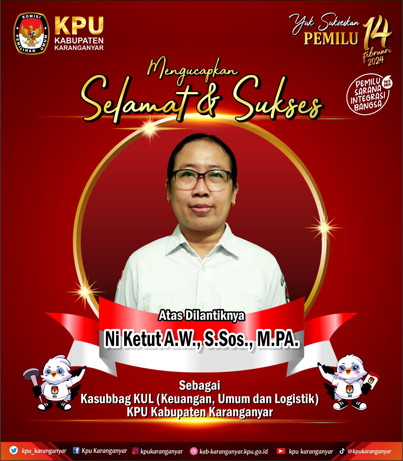 KPU Kabupaten Karanganyar mengucapkan Selamat dan Sukses atas Dilantiknya Ni Ketut A.W., S.Sos., M.PA. sebagai Kasubbag KUL (Keuangan, Umum, dan Logistik) di KPU Kabupaten Karanganyar.