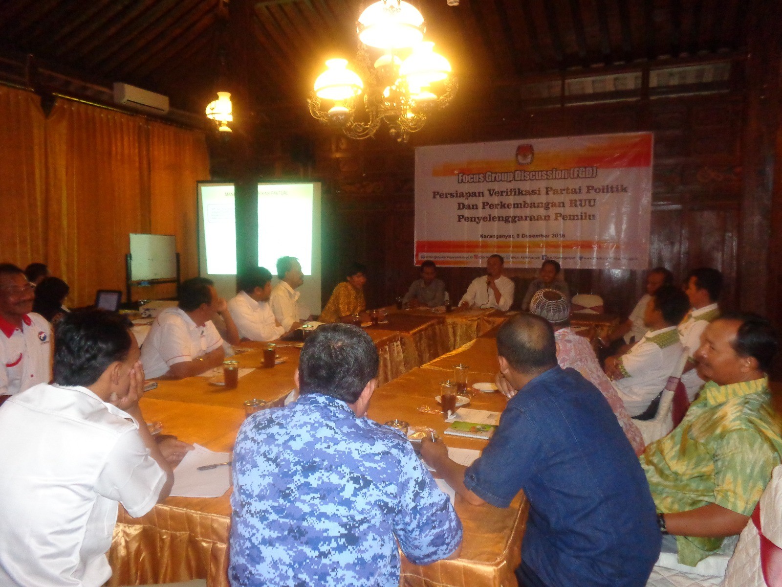 KARANGANYAR-Pemilihan Umum Tahun 2019 memang masih sekitar 3 Tahun lagi, namun pelaksanaan tahapan Pemilu Nasional segera akan dimulai Tahun depan. Komisi Pemilihan Umum (KPU) Kabupaten Karanganyar berinisiatif mengajak partai politik di Wilayah Kabupaten Karanganyar untuk lebih dini bersiap menyongsong Pemilu 2019. Kamis (8/12/2016) KPU Kabupaten Karanganyar menggelar Focus Group Discussion (FGD) bersama 14 pengurus partai politik yang terdaftar di Kabupaten Karanganyar. 14 Parpol tersebut adalah Partai NasDem, Partai Kebangkitan Bangsa, Partai Keadilan Sejahtera, Partai Demokrasi Indonesia Perjuangan, Partai Golongan Karya, Partai Gerindra, Partai Demokrat, Partai Amanat Nasional, Partai Persatuan Pembangunan, Partai Hanura, Partai Bulan Bintang, Partai Keadilan dan Persatuan Indonesia, serta Partai Perindo dan Partai Solidaritas Indonesia. Bertempat di Rumah Makan SFA Steak dan Resto Karanganyar, FGD mengambil tema Persiapan Verifikasi Faktual Partai Politik dan Perkembangan RUU Penyelenggaraan Pemilu. Dikatakan Ketua KPU Kabupaten Karanganyar, Sri Handoko Budi Nugroho, pada saat ini Rancangan Undang-Undang (RUU) tentang Penyelenggaraan Pemilihan Umum telah diserahkan pemerintah kepada Dewan Perwakilan Rakyat (DPR) untuk dibahas. “Beberapa materi dalam RUU tersebut ada hal yang perlu dicermati, antara lain verifikasi partai politik dan penetapan calon terpilih anggota Dewan Perwakilan Rakyat,” Kata Sri Handoko Budi Nugroho. Hal yang sedikit berbeda dalam RUU tersebut adalah adanya penyerentakan Pemilu. Nantinya, Pemilu Nasional Tahun 2019 digelar Pemilihan Anggota DPR, DPD dan DPRD bersamaan dengan Pemilihan Presiden dan Wakil Presiden. Dikatakan Budi Sukramto, Komisioner KPU Kabupaten Karanganyar divisi sumber daya manusia dan partisipasi masyarakat, bahwa sistem pemilu anggota DPR, DPRD Provinsi dan DPRD Kabupaten/Kota menggunakan sistem proporsional terbuka terbatas. Selain itu, lanjut Budi Sukramto, penghitungan perolehan kursi untuk DPRD agak sedikit berbeda. “Penghitungan suara Pemilu lalu menggunakan metode kuota dengan sisa suara (largest remainder) atau hare quota. Pemilu 2019 nanti berubah menjadi metode Divisor Sainte-Lague yang dianggap memiliki derajat proporsional paling tinggi dan lebih netral,”jelas Budi. Metode tersebut tertuang dalam RUU Penyelenggaraan Pemilu pasal 394 yang menyebutkan bahwa metode konvensi suara menjadi kursi dilakukan dengan pembagi pecahan 1,4 dan diikuti secara berurut oleh bilangan pembagi ganjil 3; 5; 7 dan seterusnya. (Inisial_1)